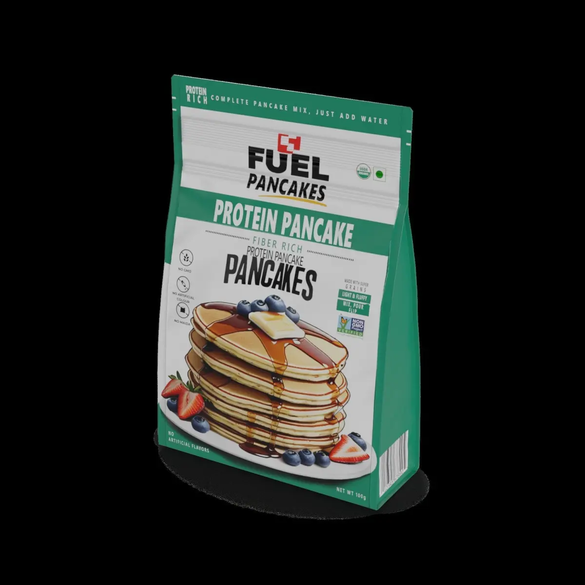 Protein Pancake Mix: A resealable bag filled with protein pancake mix. The bag has a matte finish and a modern design, with a combination of earthy tones like brown and green. The front of the bag showcases the product name and a graphic of a stack of pancakes. On the back, you'll find instructions for preparation and a label that says Fuel your mornings with protein-packed pancakes!
