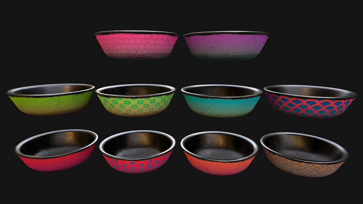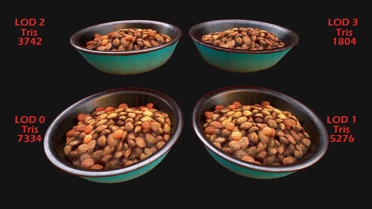 Game ready model .The model contains lods, detailed information on the images.Stylized and detailed Pet Food Bowl Cookies Pack fully textured, sculpted and rendered with Physical based rendering (PBR) - Shown images have been rendered in Marmoset Toolbag .The set contains 10 color paints.The set contains:Bowl, Bowl with Food, Food in Packaging, 6 pieces of food.