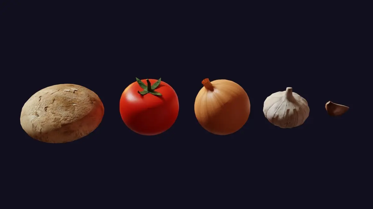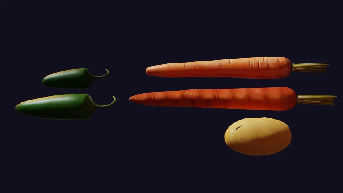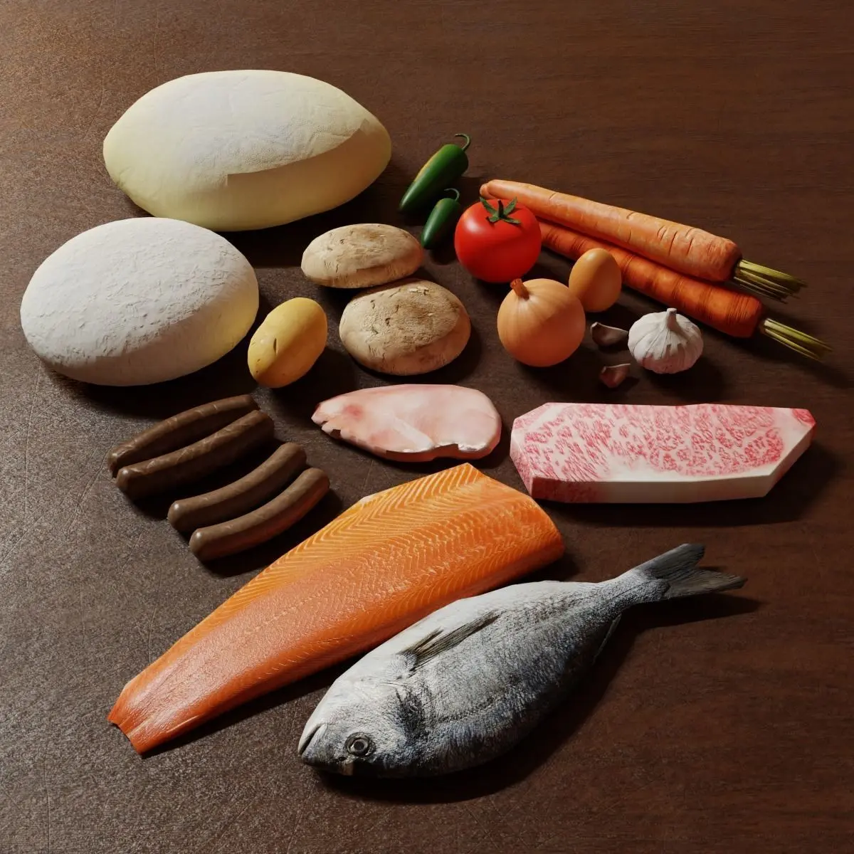 pack of various food ingredients.made with BLENDERit includes a variety of vegetables and proteinspack includes:individual mesh files in OBJ and FBXPBR METALLIC/ROUGHNESS textures in Targa and JPG format options. 2048X2048, 1080X1080, 720X720ingredients list:
