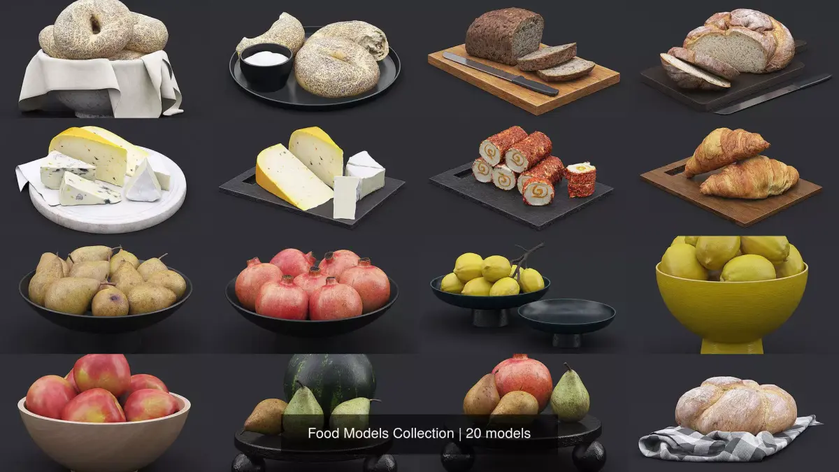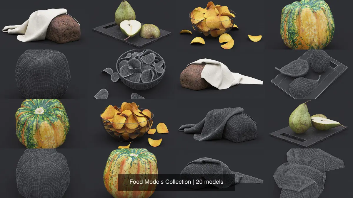 Collection of 20 Photogrammetry Scanned 3D models of dishes/food. Each of them been retopoliged to reduce the polycount and each has been scanned from each side so you can rotate and place them in your scene at any angle.