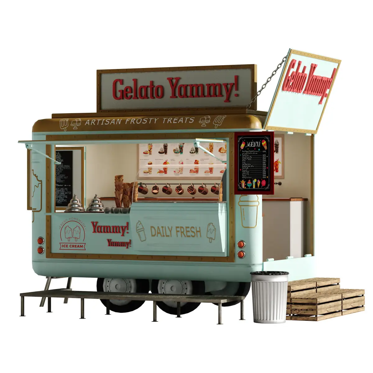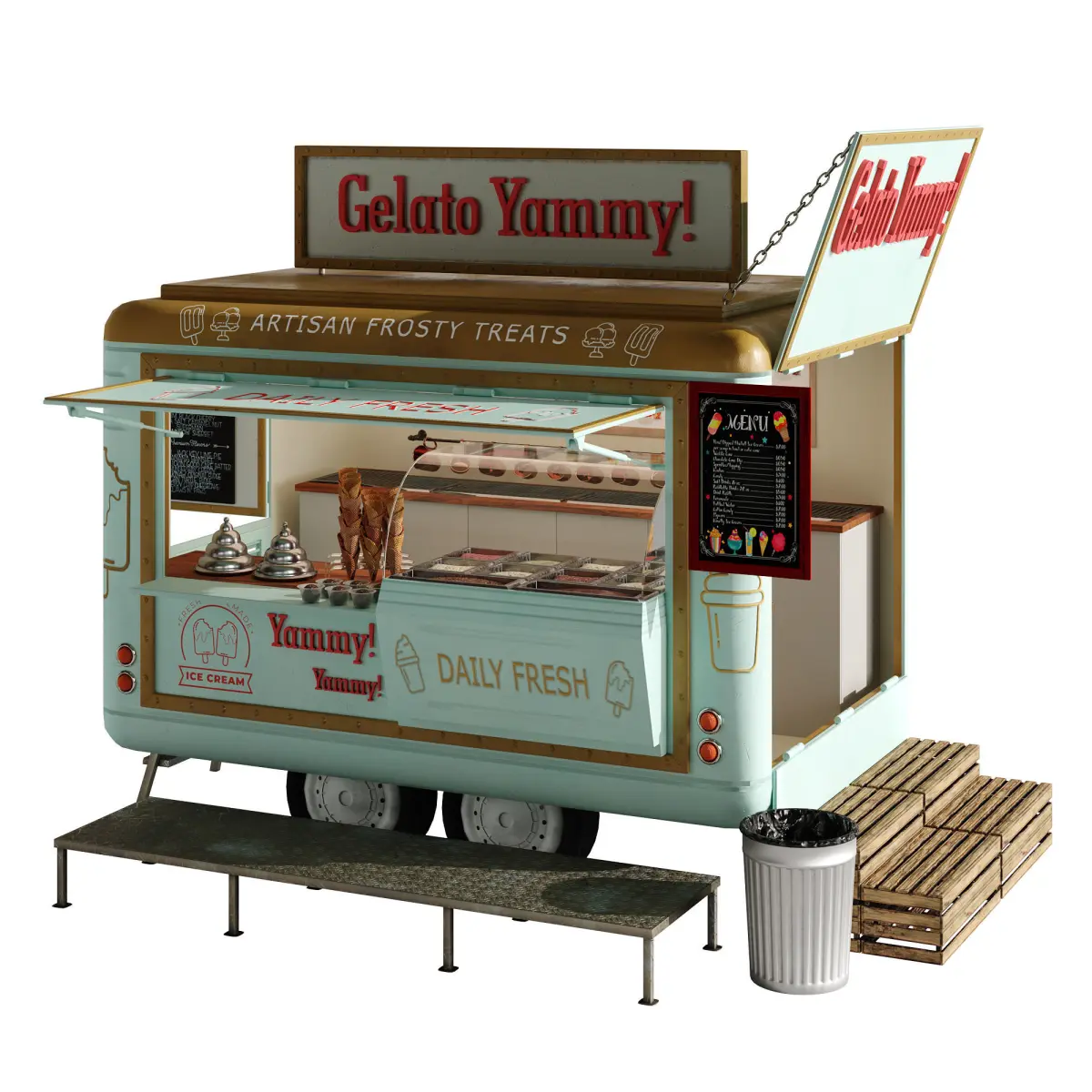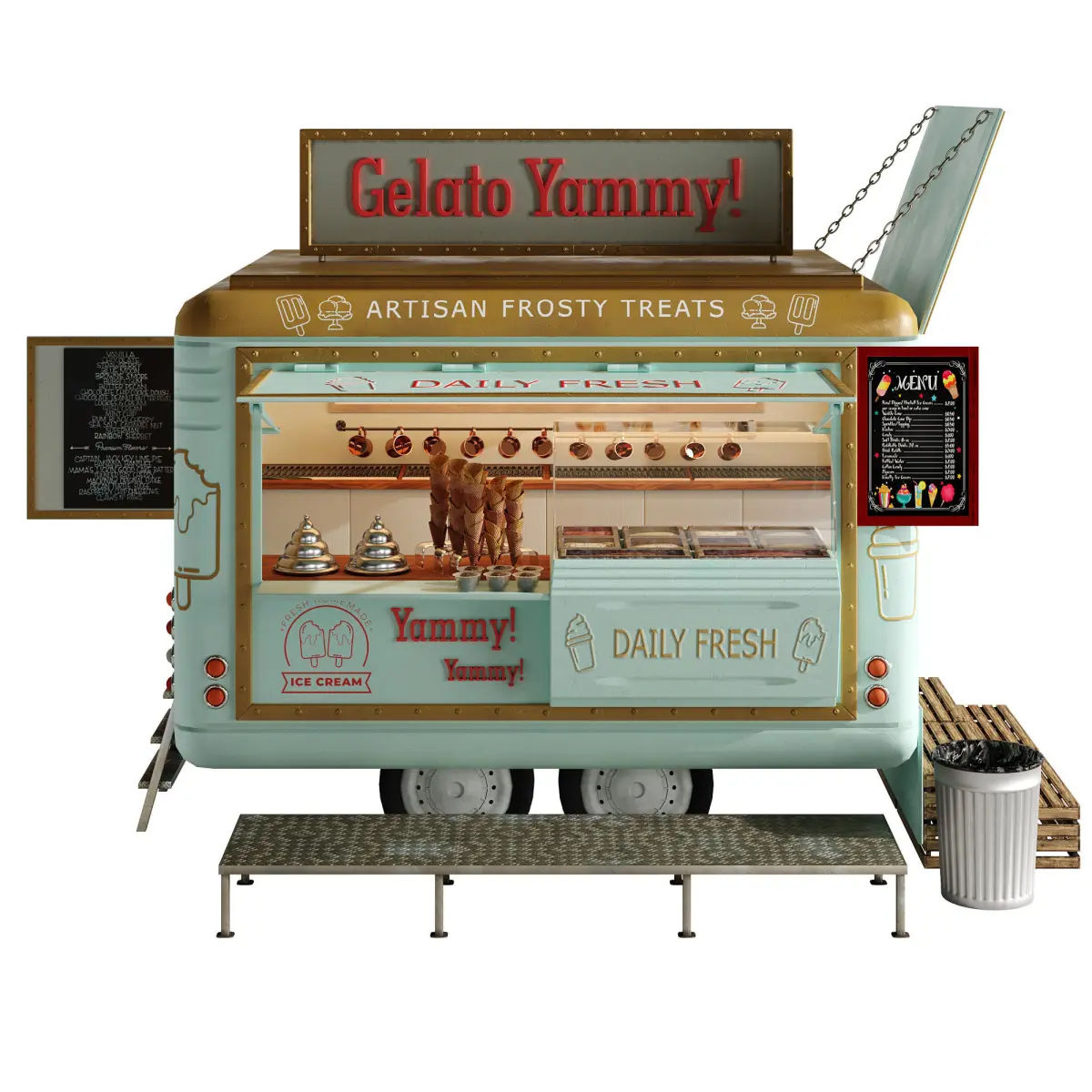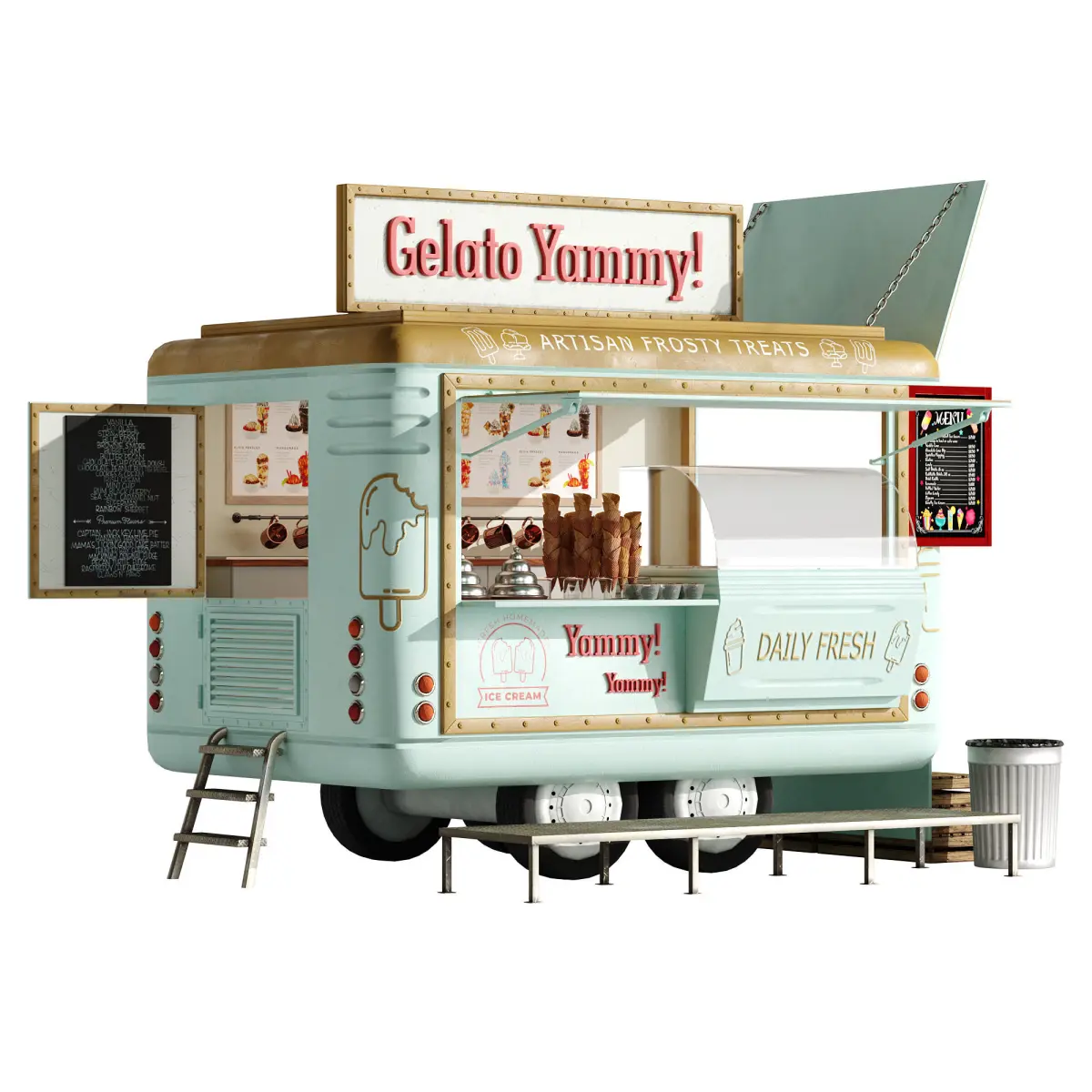 Realistic model of Food Truck IceCream green set 2Models ready for render.No errors on opening.Units used: mm.No special plugin needed to open scene.Model is modeled in real world scale.Model is fully textured with all materials applied.