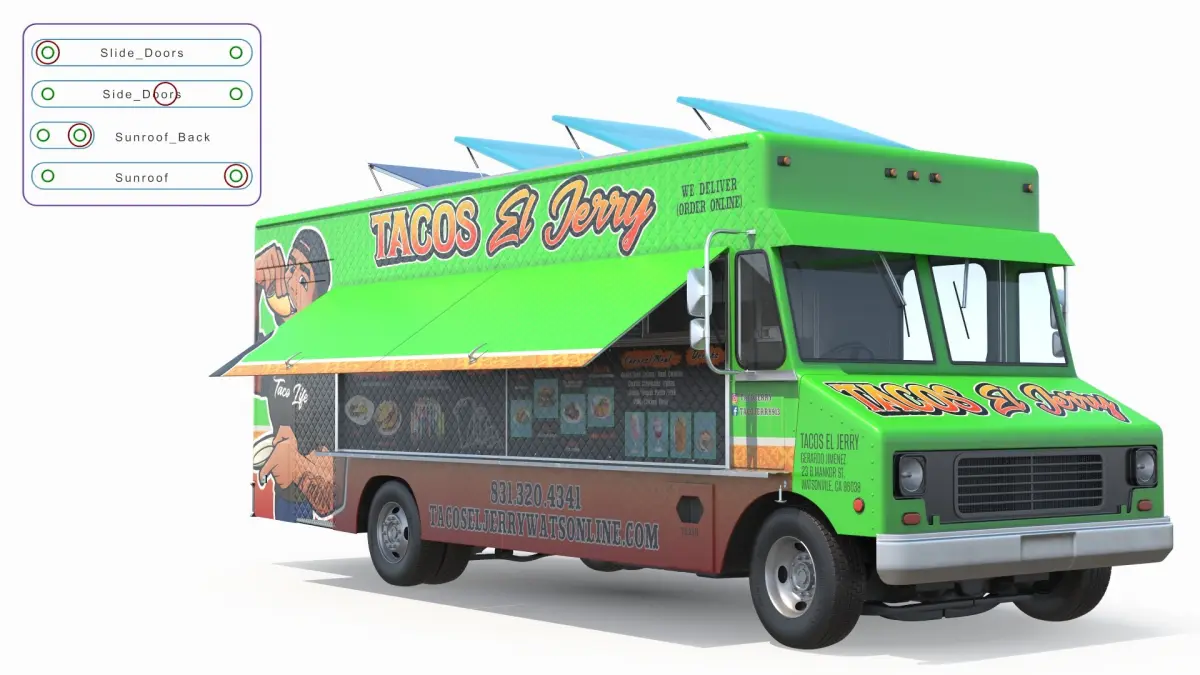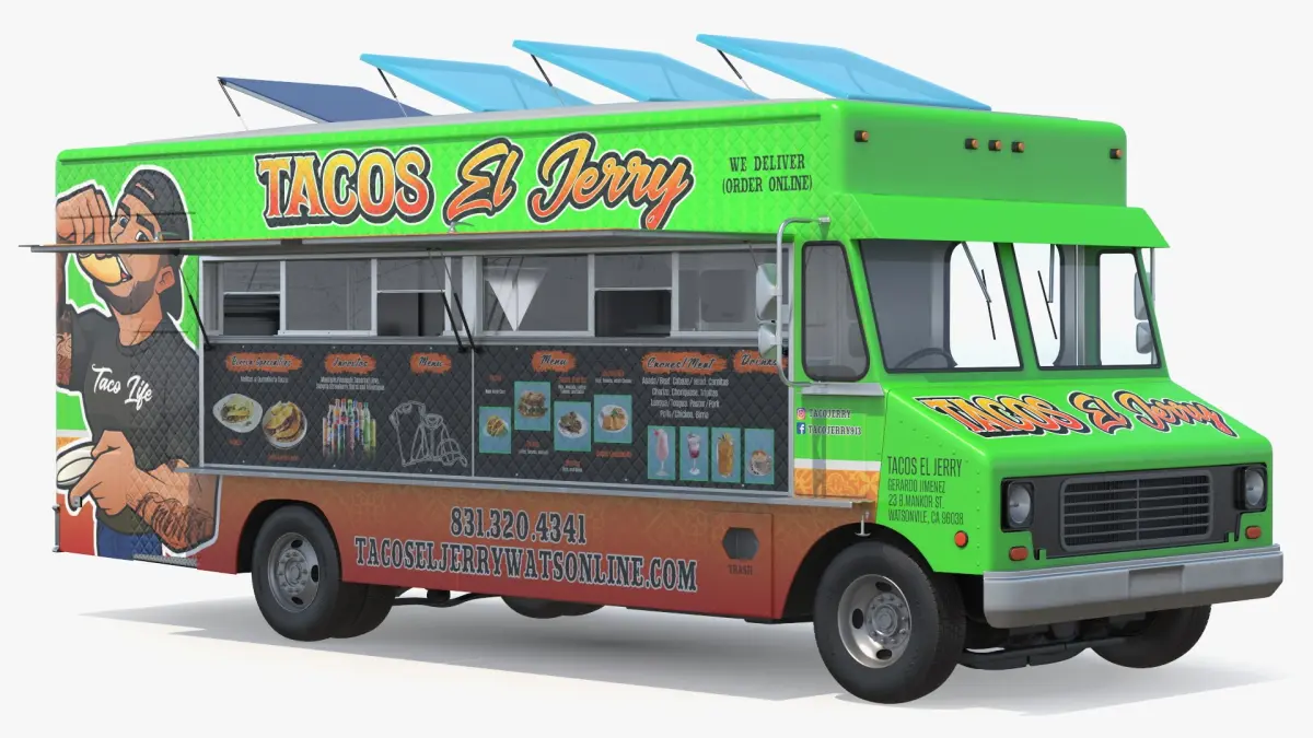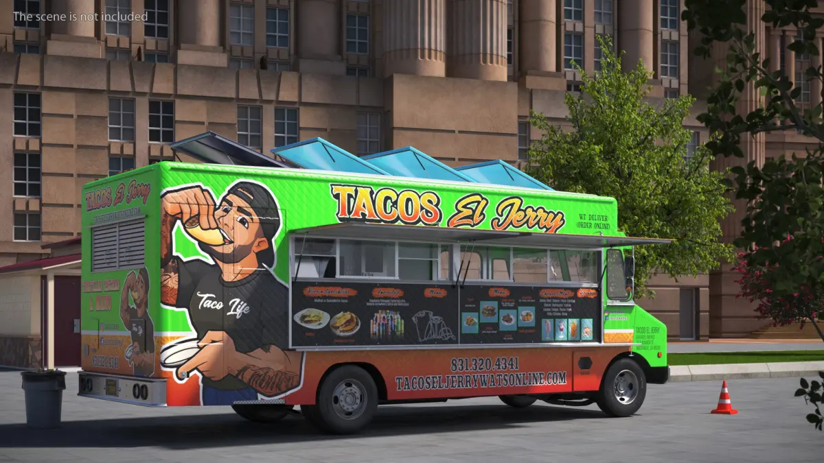 Food Truck Tacos El Jerry Green Rigged is a three-dimensional model of Mexican tacos street food vendor van (light truck), that is equipped with a roof mounted solar-charged energy system.