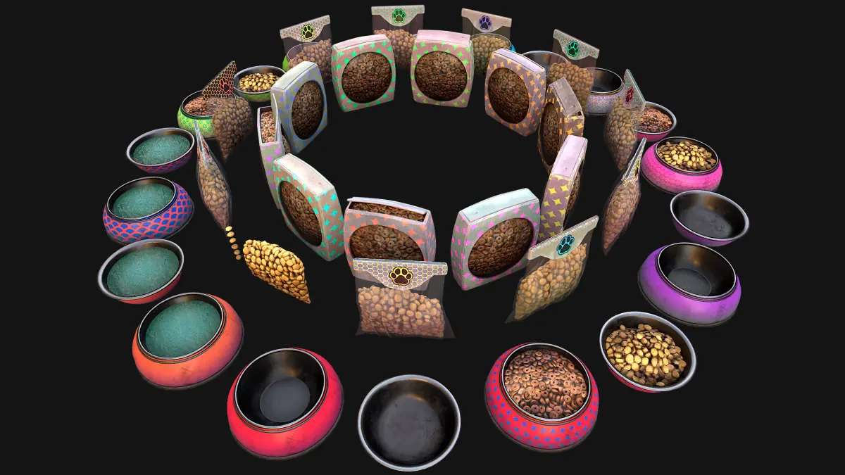Game ready model .The model contains lods, detailed information on the images.Stylized and detailed Pet Food Bowl Cookies Pack fully textured, sculpted and rendered with Physical based rendering (PBR) - Shown images have been rendered in Marmoset Toolbag .The set contains 10 color paints.The set contains: 2 Bowls, 2 Bowls with Food, 2 Food in Packaging, 10 pieces of food,2 Bowls with Water.