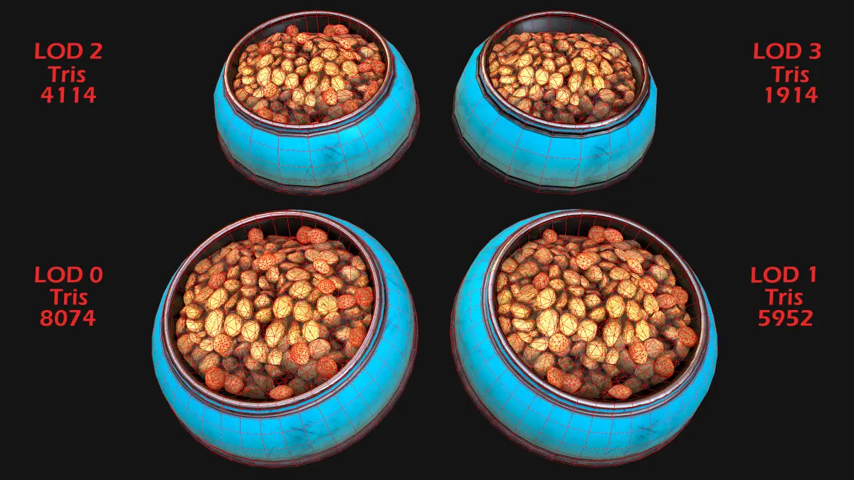 - Edges: 14227(LOD0),10041(LOD1),7018(LOD2),2694(LOD3).