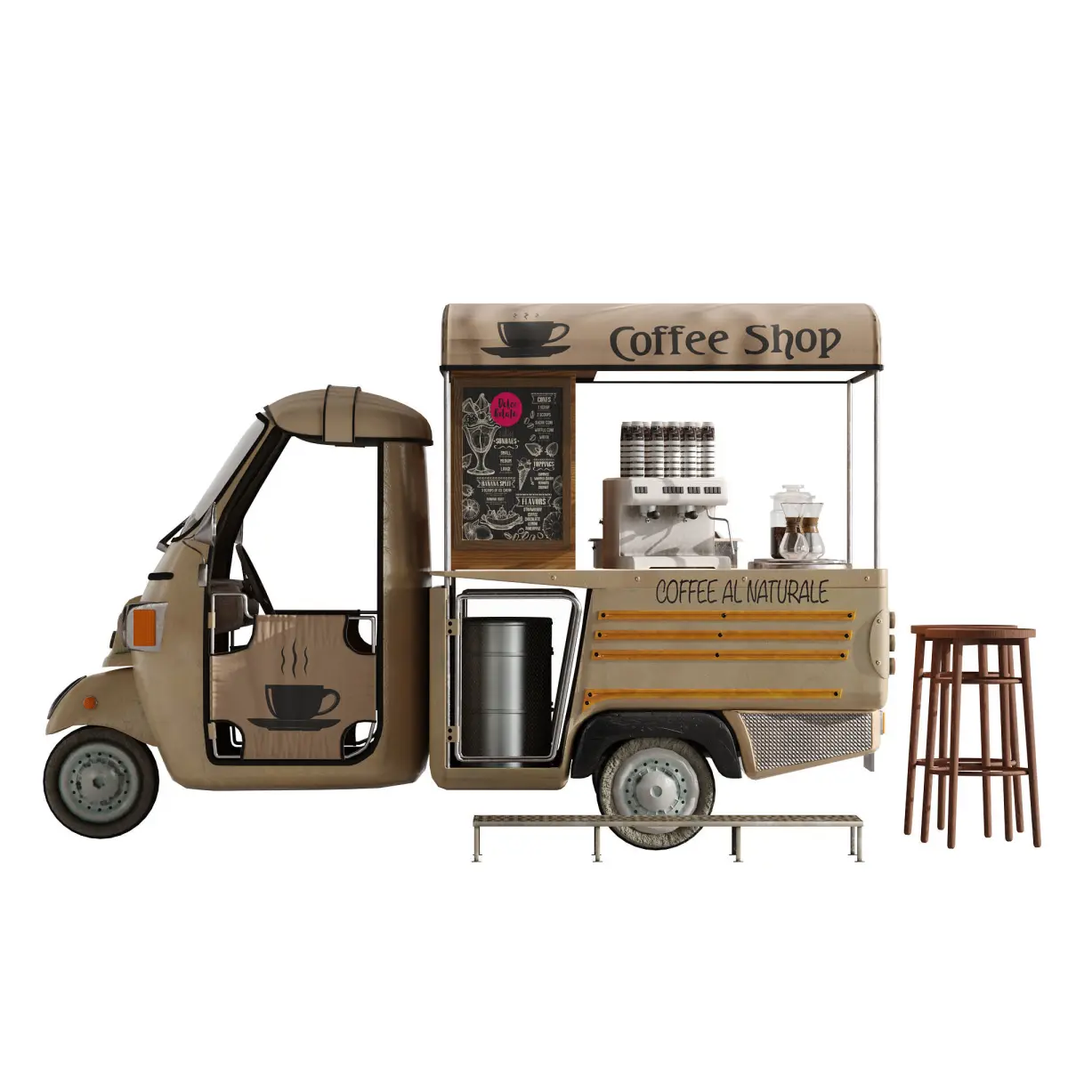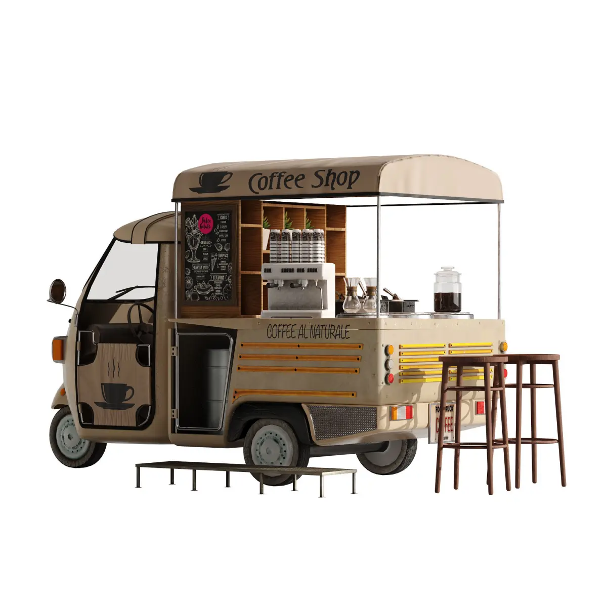 Realistic model of Coffeetruck set 5Models ready for render.No errors on opening.Units used: cm.No special plugin needed to open scene.Model is modeled in real world scale.Model is fully textured with all materials applied.