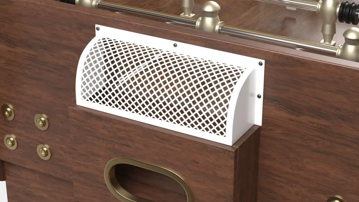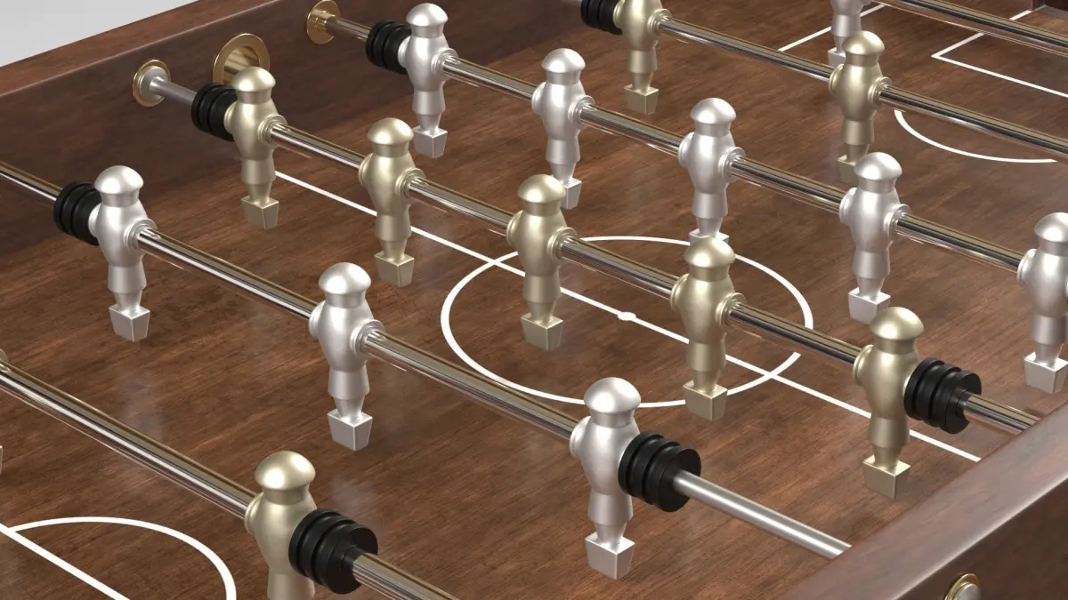3D model of a wooden foosball table. It features retractable rods, aluminium players and golden parts.It is a real word scale (143cm length x 76cm wide[not counting the rod handles] x 90cm tall) withofficial playing field size (121cm length x 68cm wide).