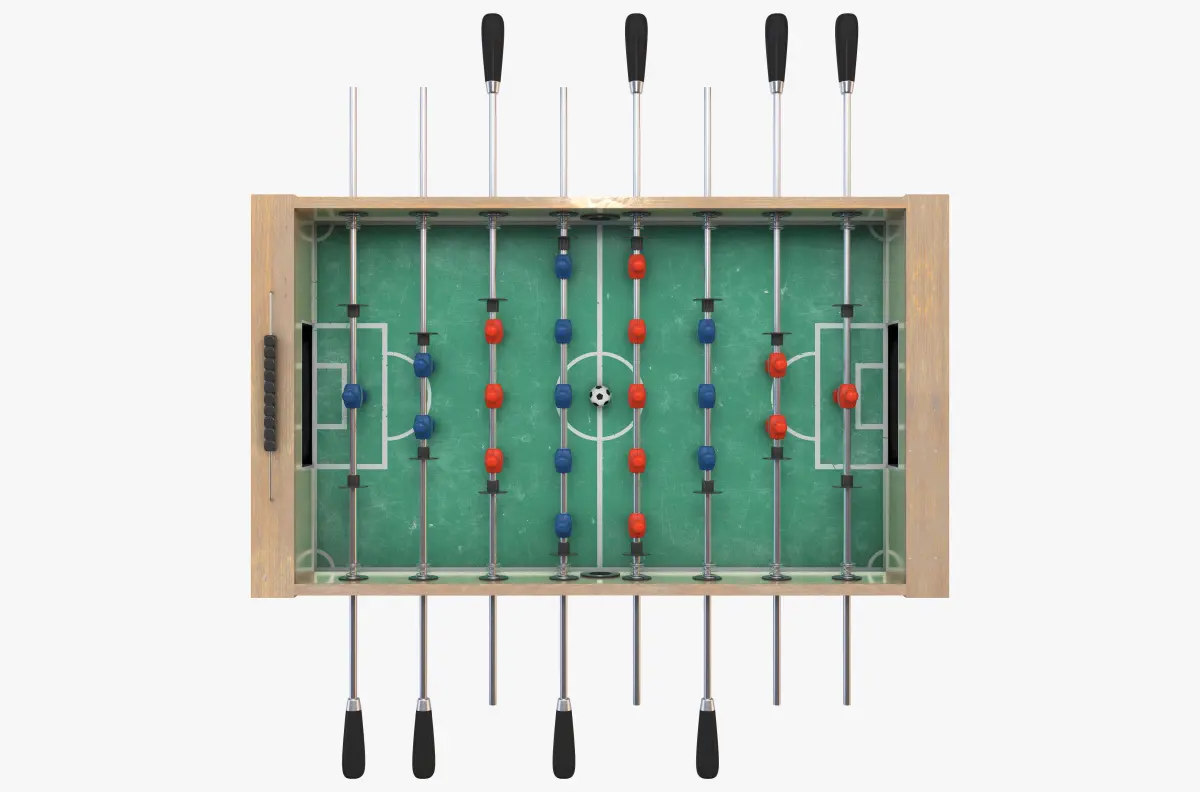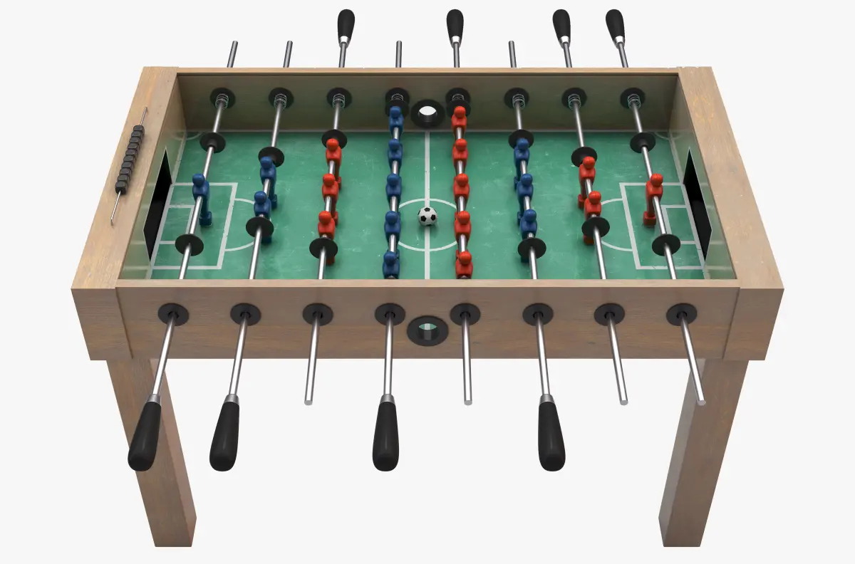 A wooden foosball table or table-football with teams in red and blue