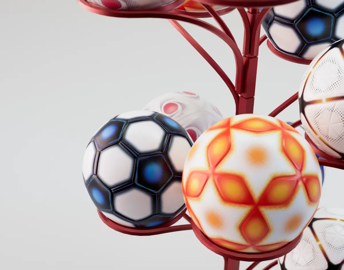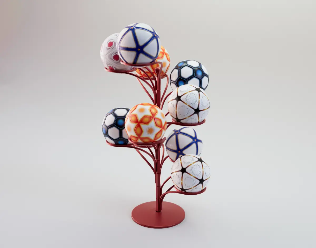 A football point of sale display stand with 5 different designs of modern panelled soccer or football balls. Contains procedural and parametrized meshes which may translate to higher poly count than stipulated if converted to other formats.Unwrapped UV textures included.