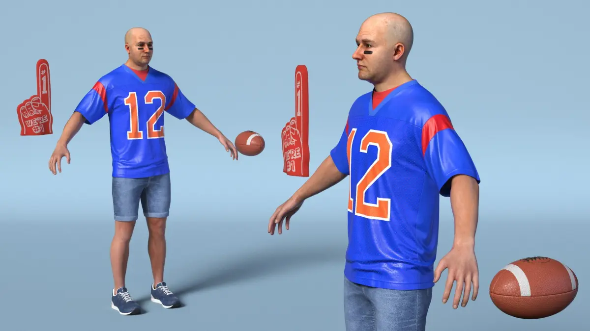 Football Fan Character with Foam Finger and Ball is a high quality, photo real 3d model that will enhance detail and realism to any of your rendering projects. The model has a fully textured, detailed design that allows for close-up renders, and was originally modeled in 3ds Max 2020 and rendered with V-Ray. Renders have no postprocessing!