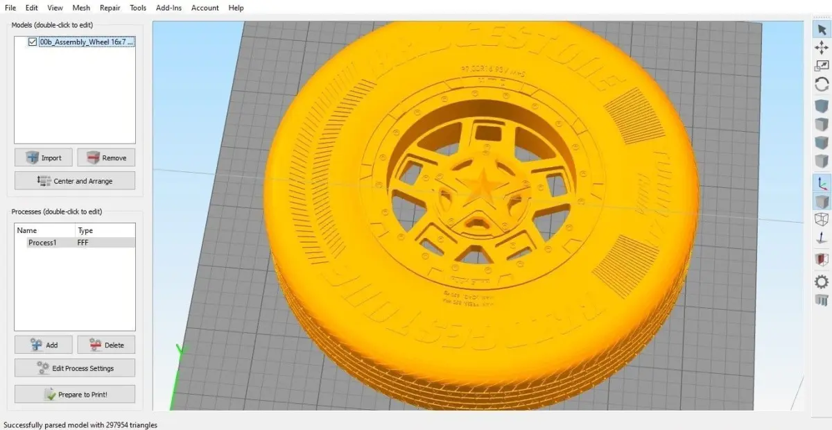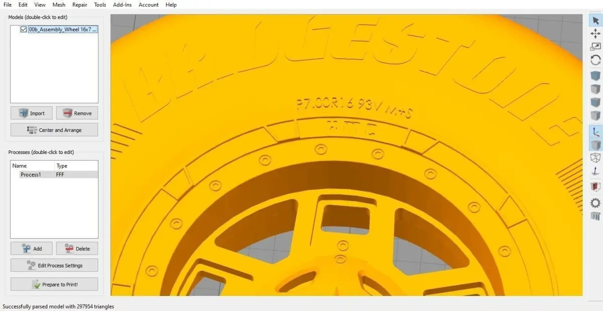 The Bridgestone wheel 7.00-16 and XD-XS 827 assembly is a 3D printable model. It was created by SolidWorks 2019 on a real-world scale.