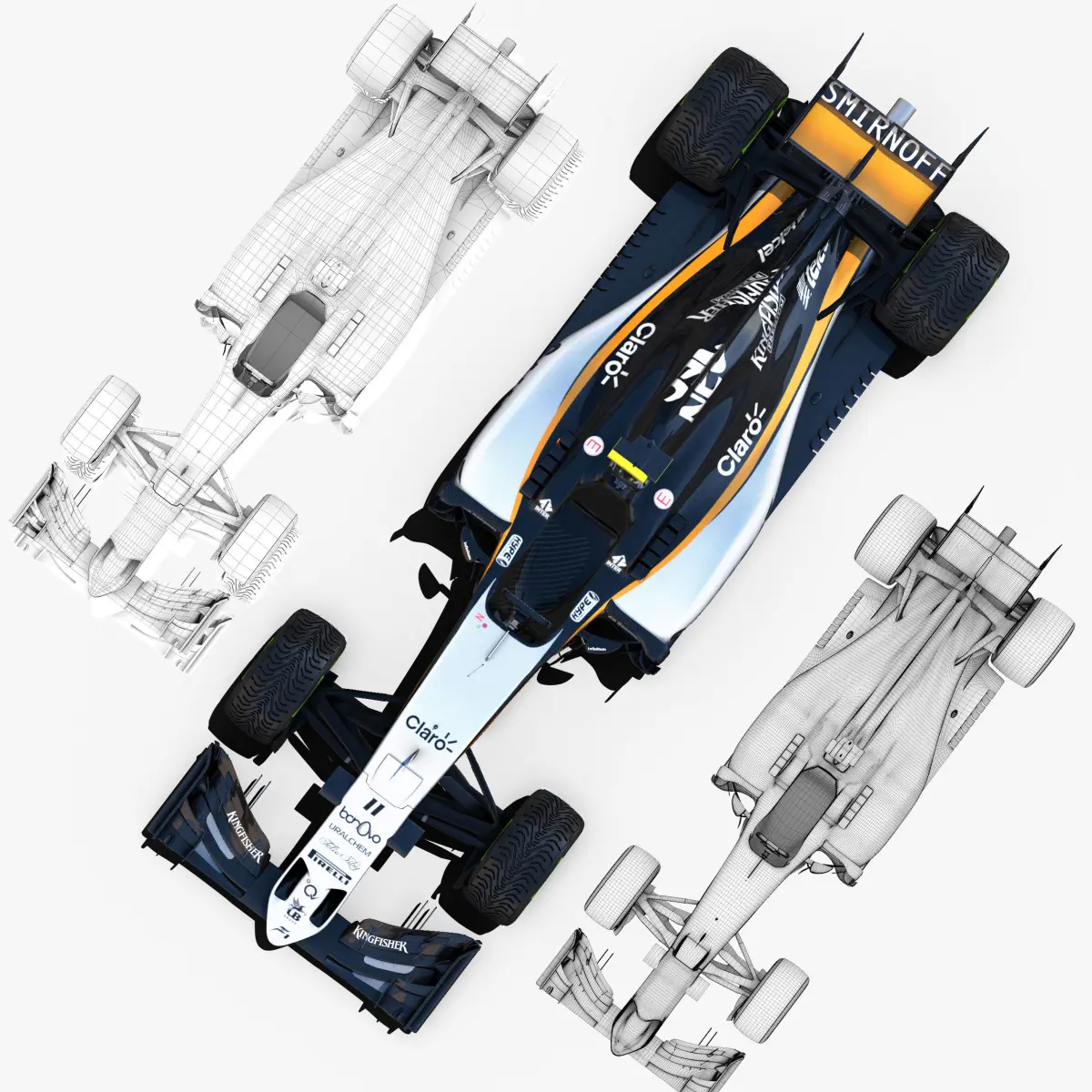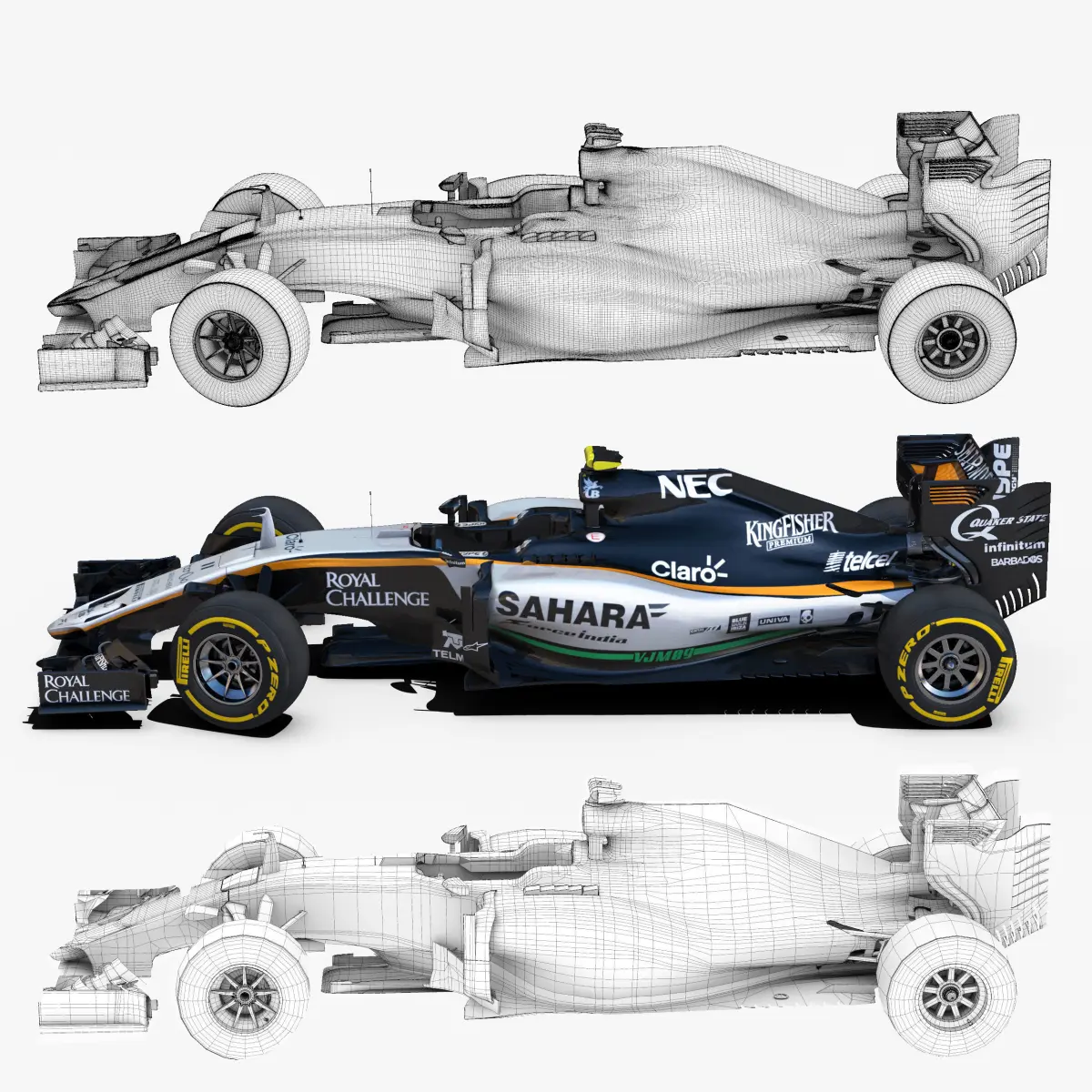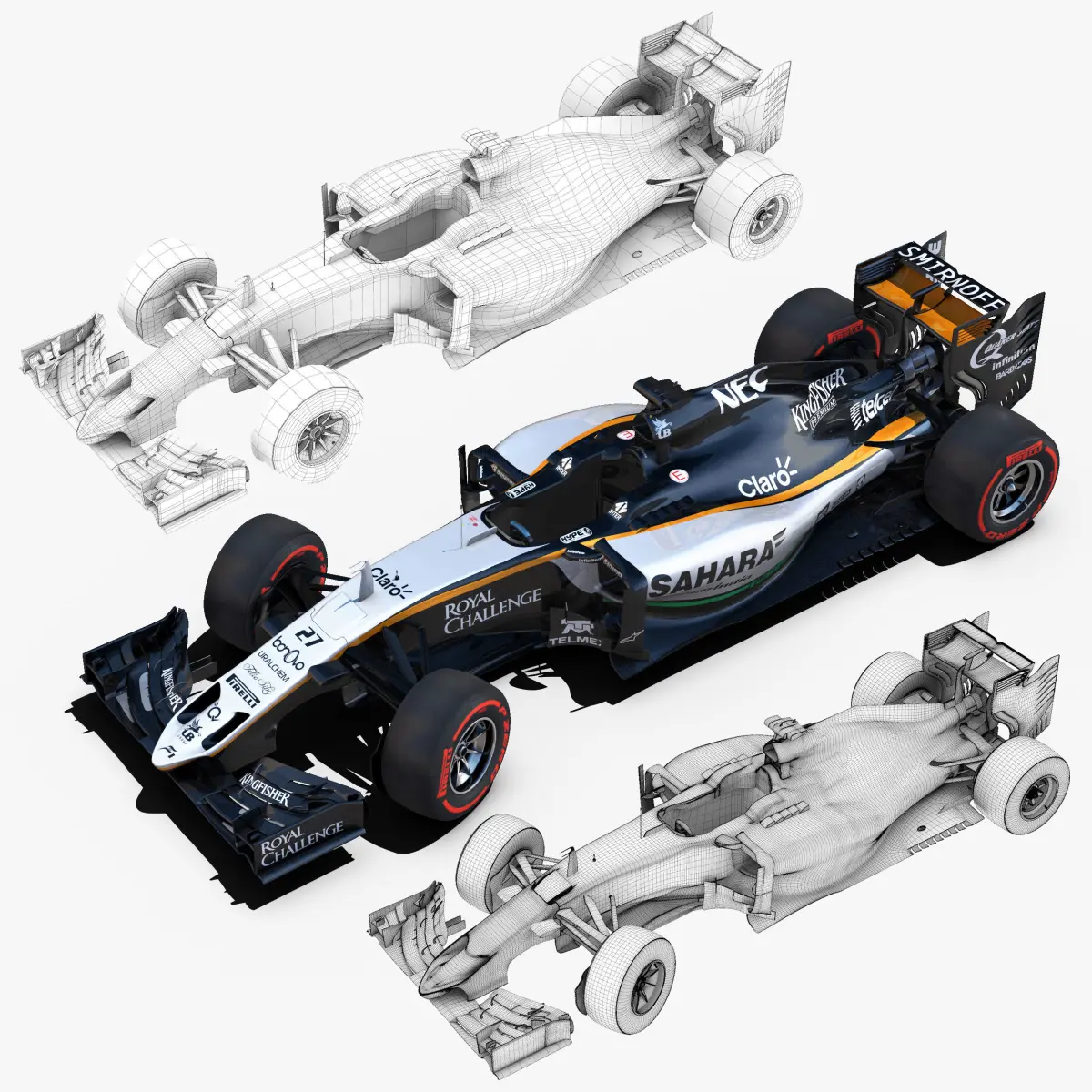 This is a 3D low poly model ,it was designed to provide a high definition in a low poly. Standard low-poly mesh with specific poly count. It`s the most accurate and realistic Force India VJM09 of the market. It has all of details of VJM09 model. Rigged in the maya version. This is a recreation of Force India VJM09 model,it can suffer modification over the season. Included all types os wheels, Sergio Perez and Nico Hulkenberg textures. The model is completely ready for use visualization in maya. For low poly model simply press 1 and for the high resolution press 3. In Cinema4d go to function menu and subdivide. In 3dmax meshsmooth In the low poly: Poly count : 66552 Vertex count : 69874 In the high poly: Poly count : 1064712Vertex count : 1077913Textures included. Each texture is in jpg format and have a 4K texture resolution for high quality It has color textures, specular textures, displacement textures,bump textures. The files are obj, fbx, mb ,c4d and 3DS. In formats c4d, 3ds, obj and fbx model exported to standard materials (textures), not contain mental ray shaders. files with the model does not contain extraneous or hidden objects (lights, cameras, etc.) Included rigging and constrains and driven keys only in the maya format. In the maya format you can easily change the wheels, the pilot and the DRS(open and close). original file format maya render in linear sRGB