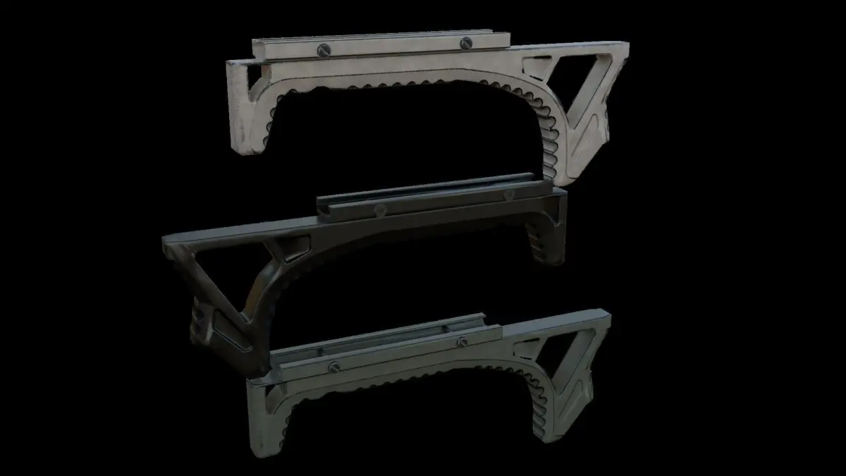 -Folding Foregrip: 2 seperate parts for ease of animation (Clamp and handle); 2K textures; black, tan and olive green; 2 732 tris; 1 446 verts.