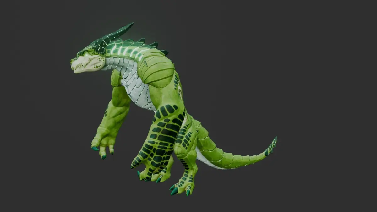 The Forest Baronto, a phantom in emerald scales, glides through dense foliage. Built for agility like its kin, its powerful legs and wicked horns navigate the forest with ease. Whispers speak of its dominion over the woods: manipulating plant growth, vanishing into leaves, or even commanding the creatures that dwell beneath the boughs.