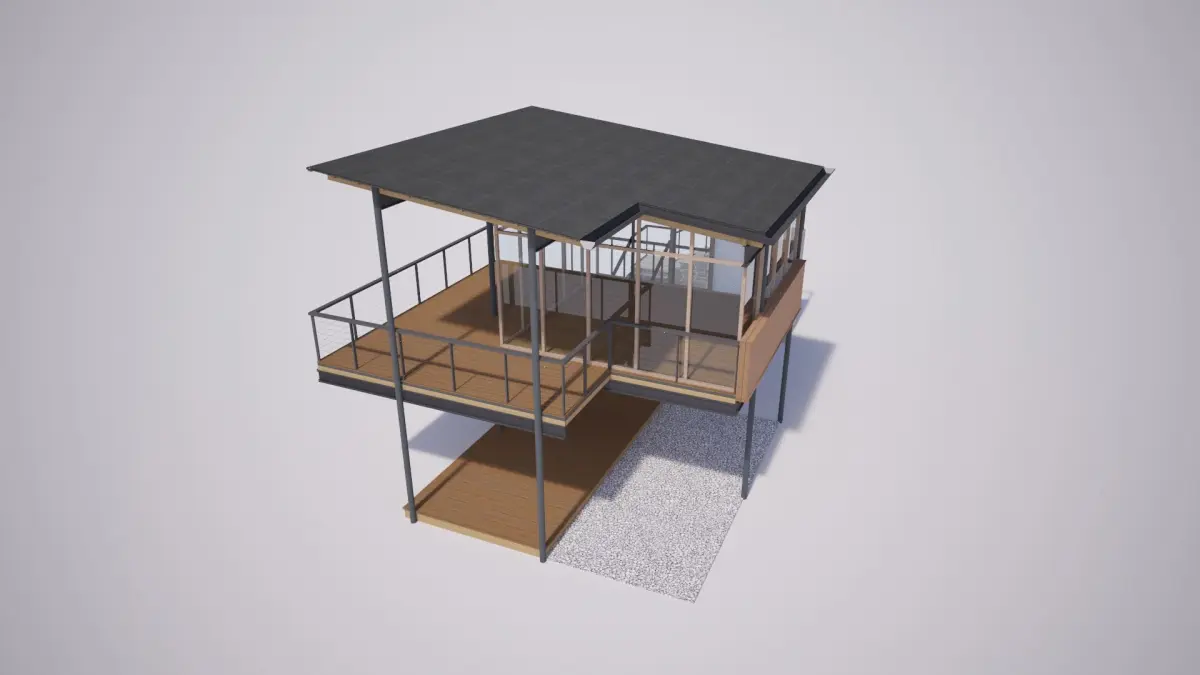 A design in modern style of a Forest Cain House. It made by steel-wood-glass structure with 2 floors, stone stair and light metal handrail