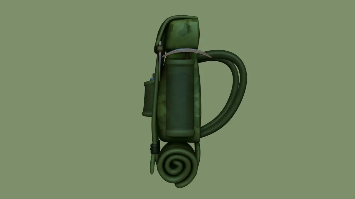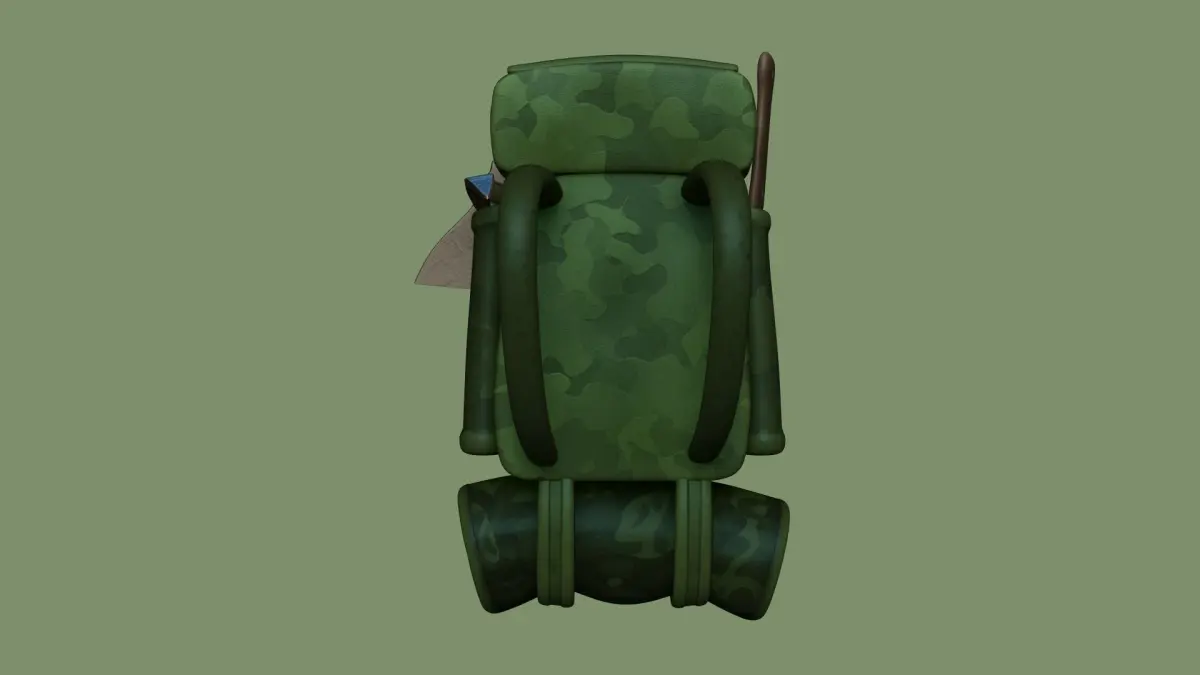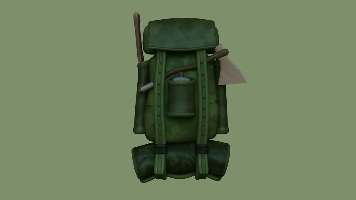 Forest Green Camouflage Backpack - Can be used for military characters, or as camping acessories - can be used as character costume/outfit/skin, or even as a decorative item.Male or female.Also included as part of backpack: Axe, Pickaxe, Long Knife, Metal Bottle - You can remove it if you prefer.In low poly version: 1356 polygons. In highest poly version: 347136 polygons (05 subdivisions).
