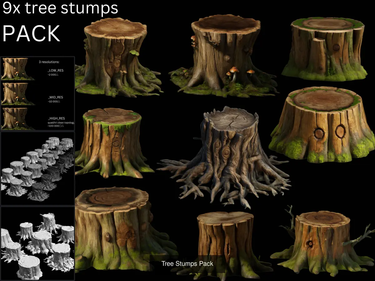 Forest related collection. Includes some mossy trees, stumps, logs, trunks and winter trees.Check collection items invidually. There should be links to each of them in the Contents section near the Model details.