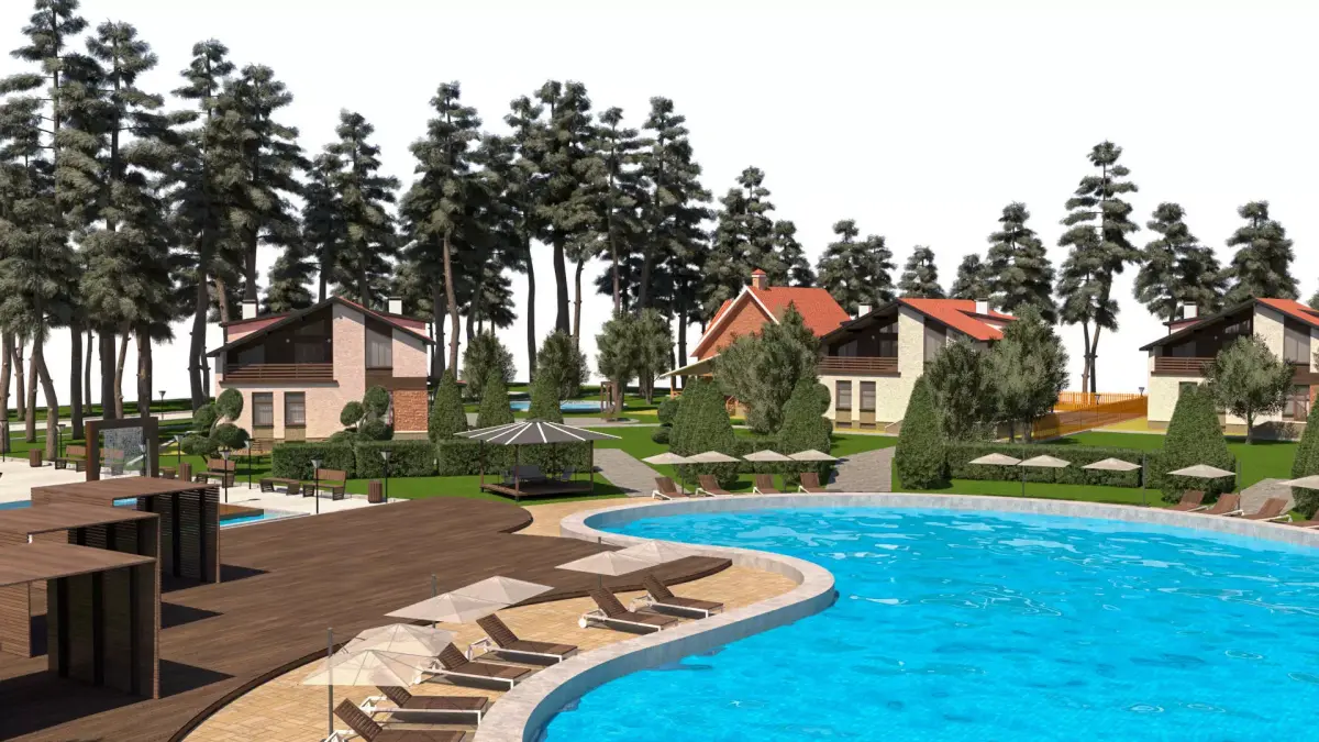 Complete Resort Layout: The model includes a comprehensive layout featuring multiple individual villas/cabins with distinct architectural styles, surrounded by dense, mature pine trees and well-manicured landscaping.