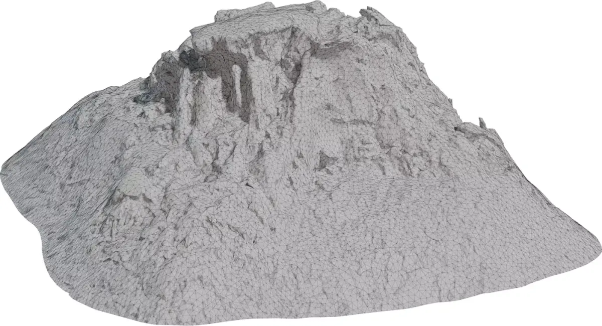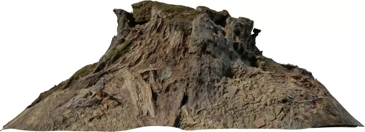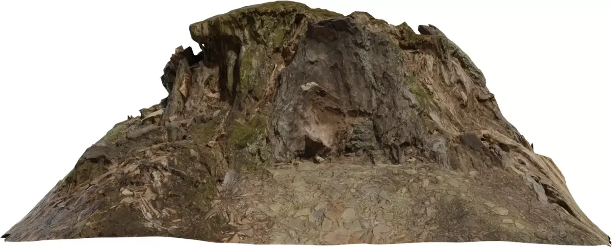 This asset is a detailed 3D scan of a forest stump‑like rock hill that blends exposed roots, broken trunk textures, moss, and stony ground into one large environment module. The form features a flat, plateau‑style top, steep eroded sides, and a rocky front face with cavities and overhangs, making it ideal as a natural focal point, boss arena center, or diorama base. High‑resolution PBR textures capture bark fibers, embedded stones, leaf litter, and moist moss patches, providing rich breakup for close‑up shots and cinematic camera moves. The mesh uses clean triangulated topology and is optimized to preserve important silhouette detail while remaining practical for real‑time engines and virtual production stages. UVs are fully unwrapped and ready for lightmapping or material blending inside major DCC tools and game engines. This stump rock hill works perfectly for fantasy forests, ruins, and nature scenes that need a ready‑to‑use hero landmark surrounded by organic ground.