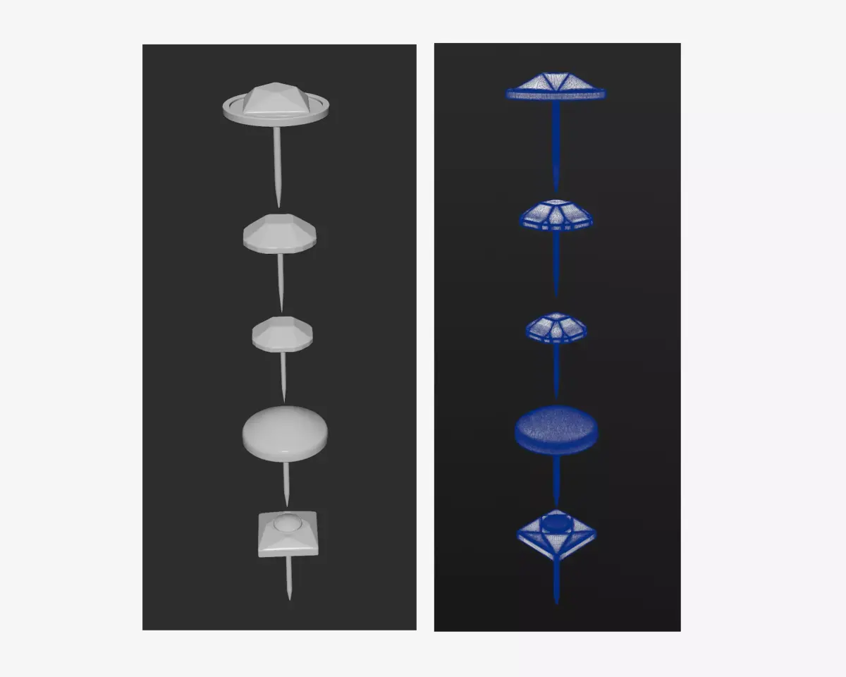 STL models are intended for 3D printing and include the nail shaft. Each nail design is supplied in multiple mesh density versions, allowing you to choose the optimal balance between detail and file weight for your printing needs.