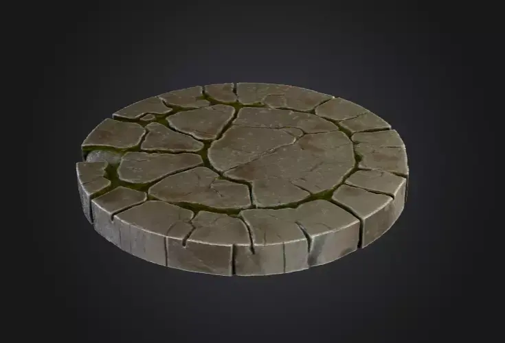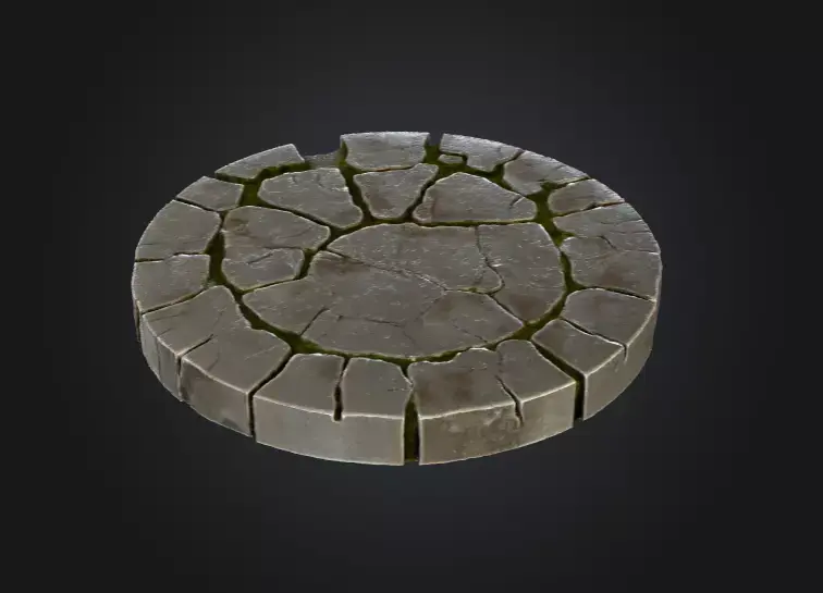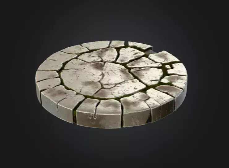 The Forgotten Arena Platform stands as a silent monument to the passage of time — a once-proud battleground now consumed by decay and neglect. This massive circular stone structure, stretching ten meters in diameter, bears the scars of countless ages. Its cracked and uneven surface tells a story of collapse and endurance; large fissures carve through the stone like veins of history, while chunks of the platform have crumbled away, leaving jagged edges and sunken sections where dust and debris have settled.