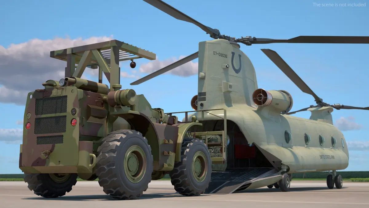 This model features a detailed forklift equipped with functional elements like forks and wheels, alongside a highly realistic CH 47 Chinook with its cargo bay open for loading. The cargo items are meticulously designed to complement the scene. The model emphasizes precision and interactivity, capturing the realistic interaction between ground equipment and the helicopter for seamless logistics planning and visualization.