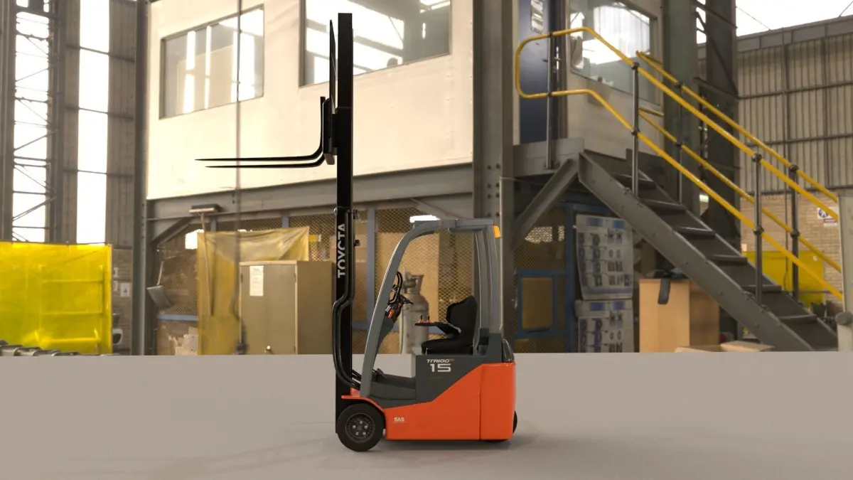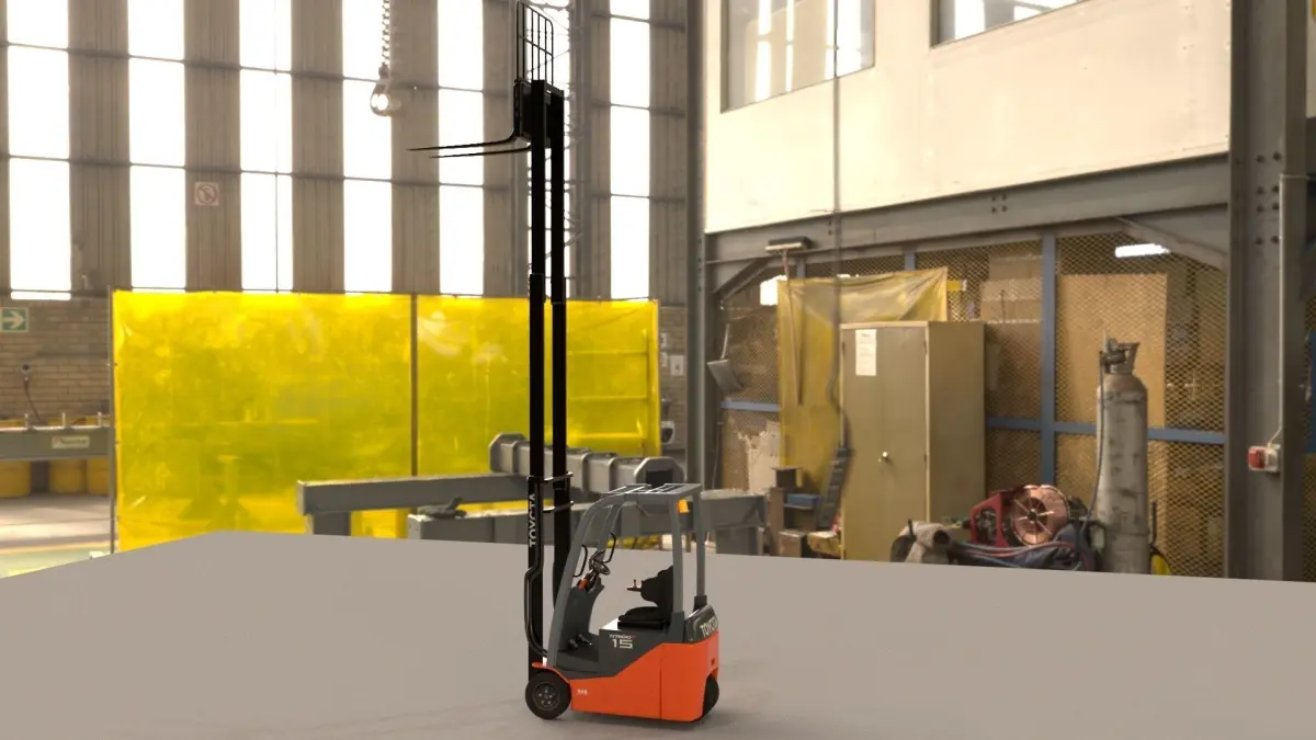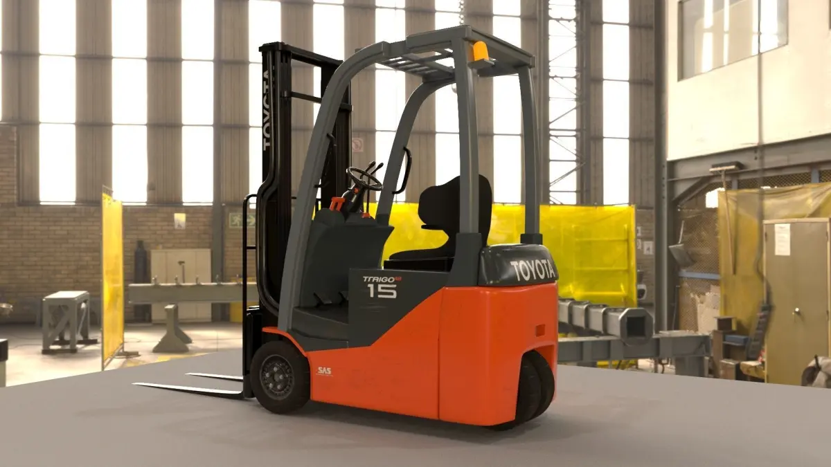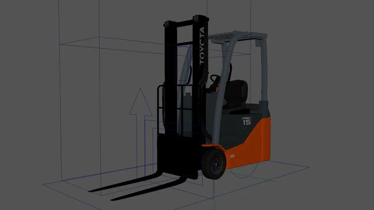 Forklift rigged to have forks move up and down at a constant rate. Wheels spin when translated at a constant rate. Has detailed textures, wear and tear, micro-bumps and more.