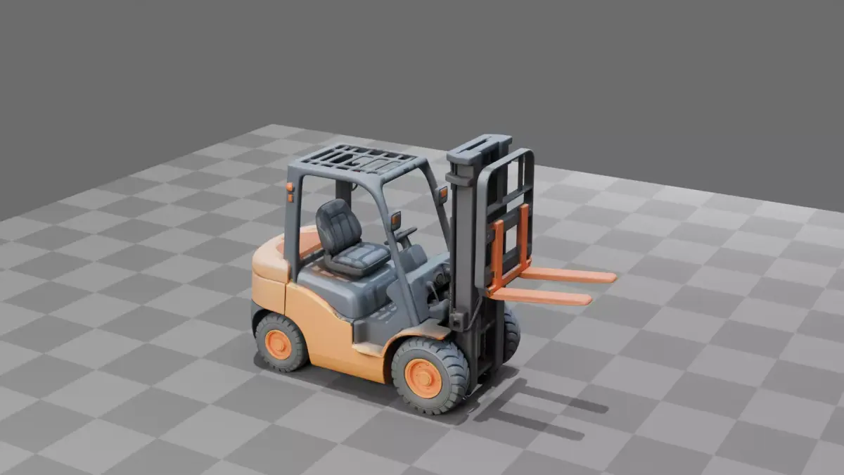 Industrial warehouse forklift with fully modeled lifting forks, overhead guard, operator seat, and hydraulic pistons. Model features separate, modular parts including body, forks, wheels, and seat with painted metal and rubber materials. 500,000 polygons with complete UV mapping, available in GLB, OBJ, and BLEND formats. Suitable for game engines, industrial visualization, VR/AR environments, and architectural renderings.