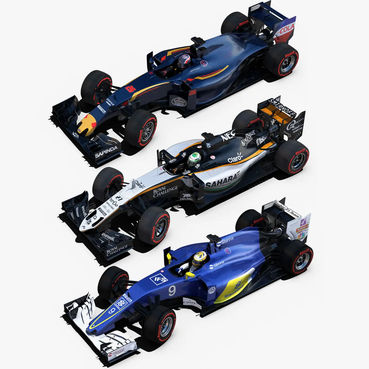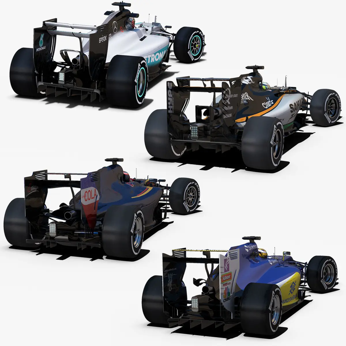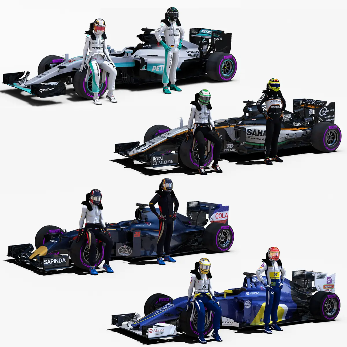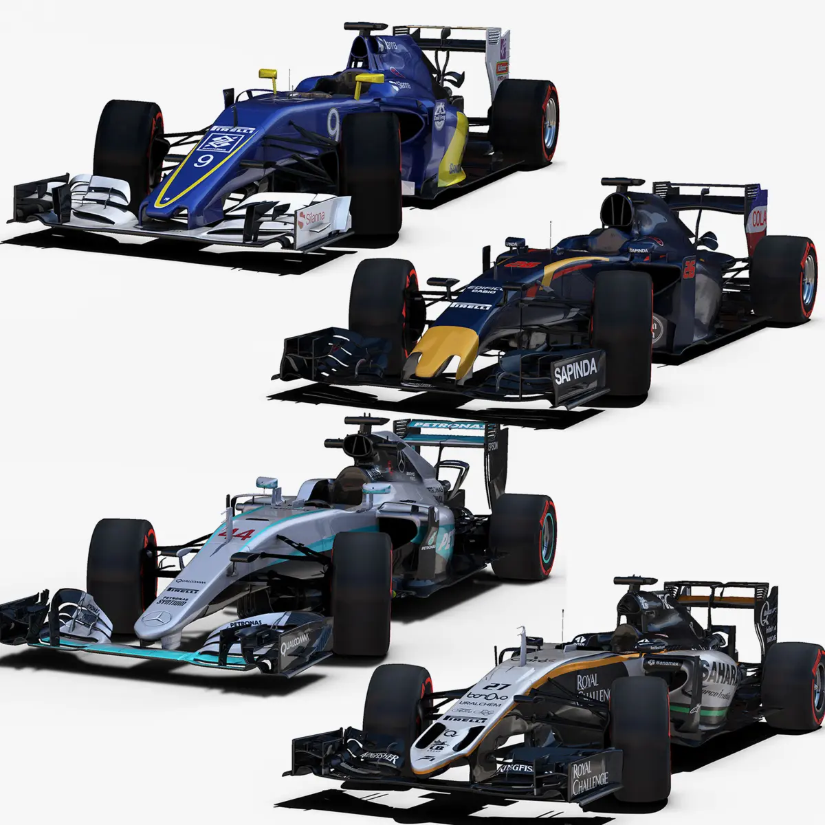 8 drivers of formula 1 2016: Rosberg, Hamilton, Sainz, Kvyat, Perez, Hulkenberg, Nasr, Ericsson. 4 cars of formula 1 2016. In the energy drink teams you have to insert the main brand logo yourself over the textures.