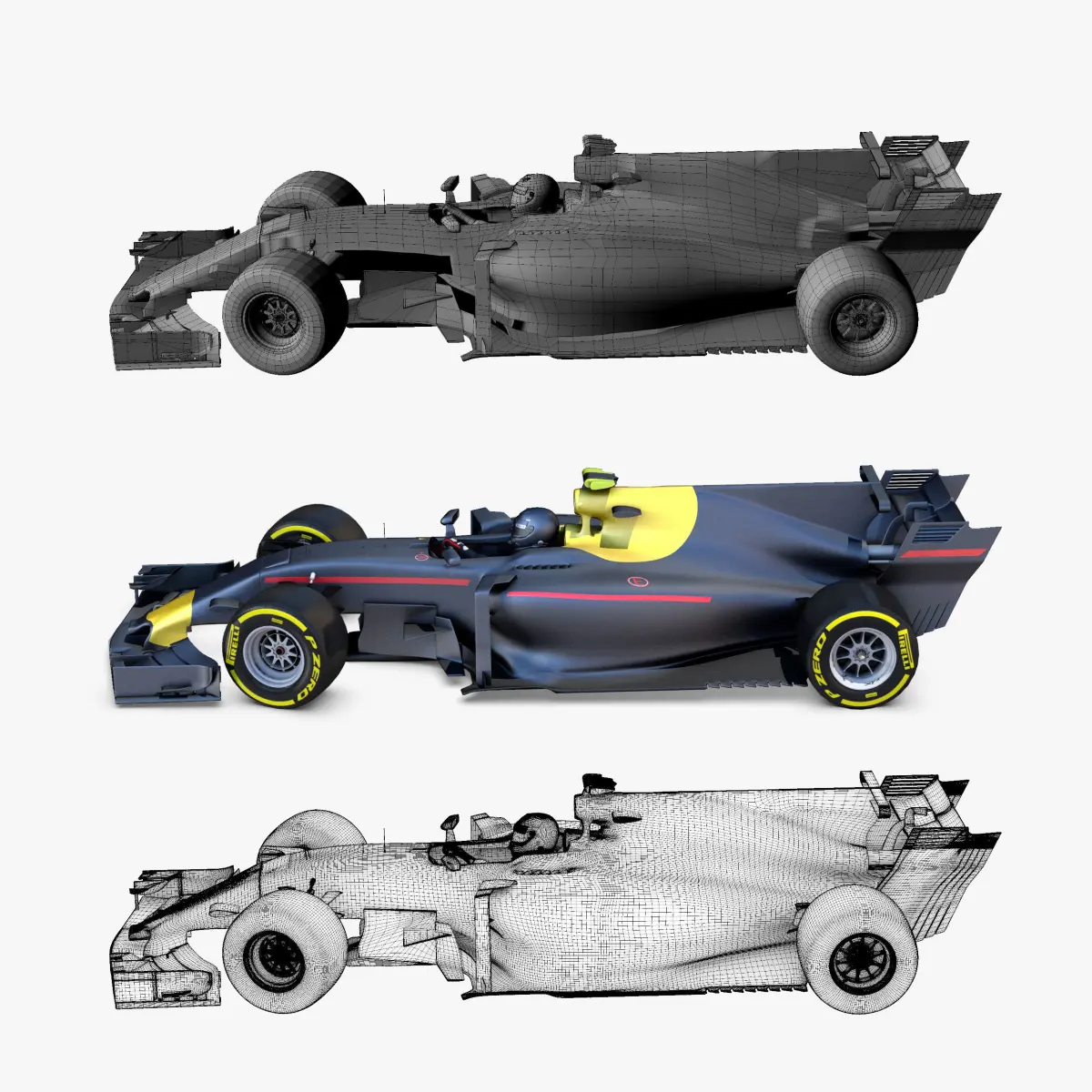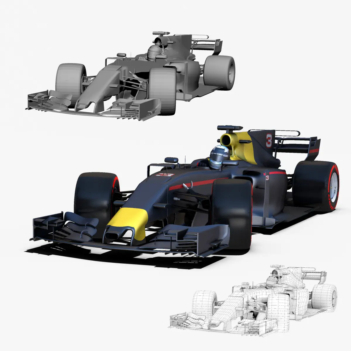 This is a 3D low poly model ,it was designed to provide a high definition in a low poly. Standard low-poly mesh with specific poly count. Rigged in the maya version. In this version joins, control curves, ik handle, blend shapes, different poses, driven key are included . In the other versions only include geometry ( one for each poses),6 poses , materials and textures. Included two drivers and 7 tyres. It`s the most accurate and realistic of the market. This is a recreation of a F1 Car model,it can suffer modification over the season. The model is completely ready for use visualization in maya. For low poly model simply press 1 and for the high resolution press 3. In Cinema4d go to function menu and subdivide. In 3dmax meshsmooth In the low poly: Poly count : 65142 Vertex count : 68369 In the smooth version: Poly count : 1071744 Vertex count : 1084496 Textures included. Each texture is in jpg format and have a 4K texture resolution for high quality It has color,displacement,normal,bump and specular texture Because of different Disk topology at different computers it might be required to change the textures path at the destination computer. The 3D model was created on real base. It's created accurately, in real units of measurement, qualitatively and maximally close to the original. Animation is not included. The files are obj, fbx,max, mb ,c4d and 3DS. In formats c4d, 3ds, obj ,max and fbx model exported to standard materials (textures), not contain mental ray shaders. files with the model does not contain extraneous or hidden objects (lights, cameras, etc.) Included rigging and constrains, blend shapes and driven keys only in the maya format. original file format maya render in linear sRGB Please feel free to contact us for any query or if you need further assistance, we will be happy to assist you.