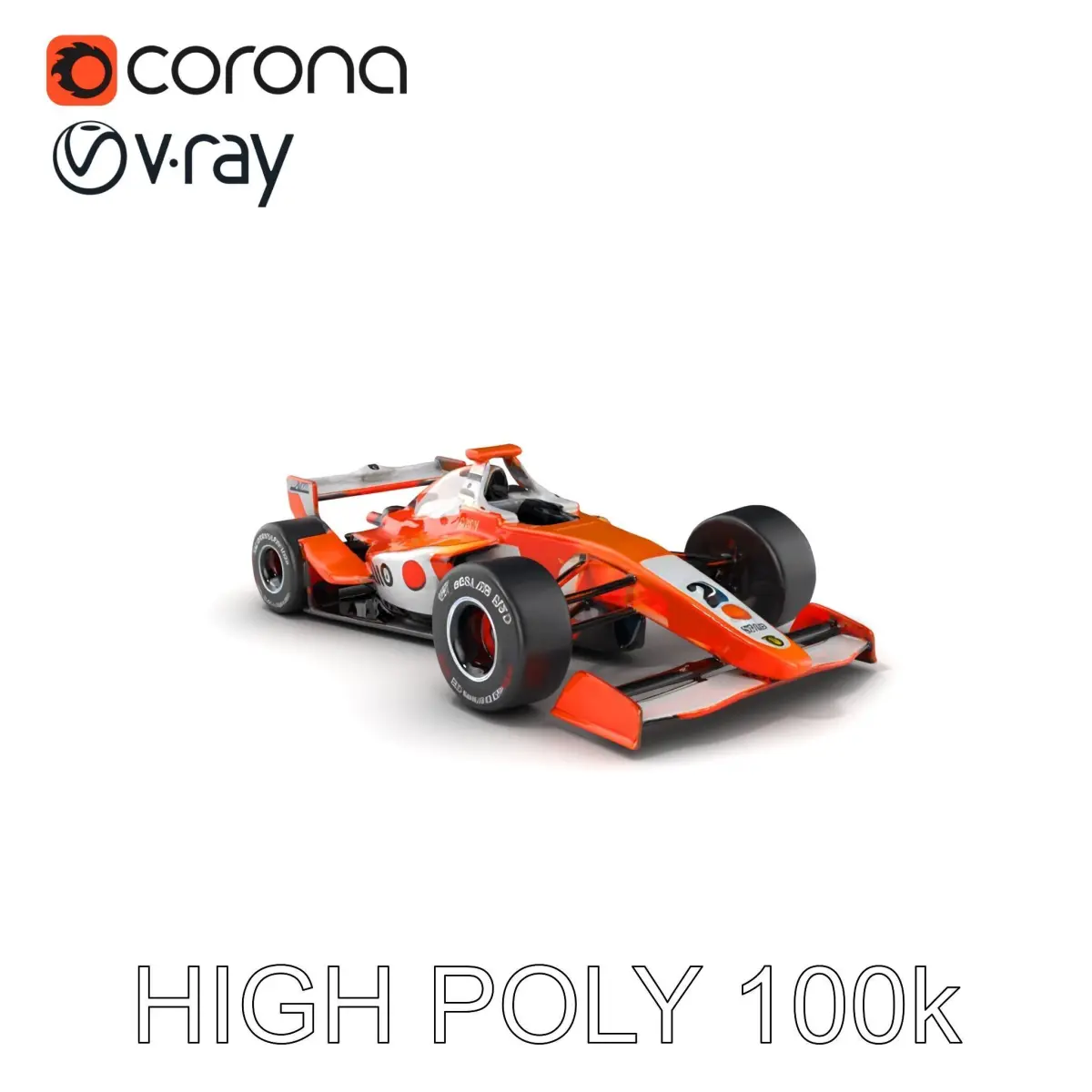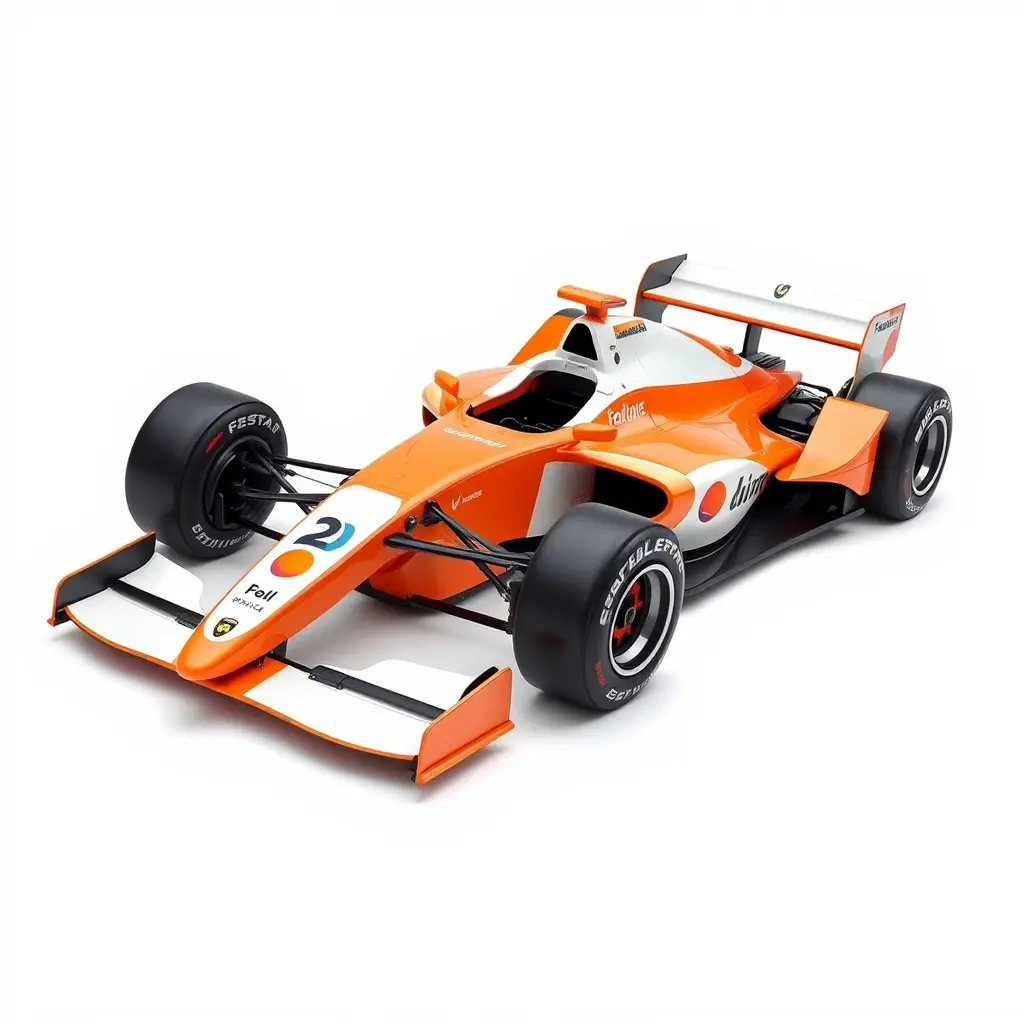 The Formula 1 automobile 3D model features a glossy orange and white color theme, detailed tire patterns, sleek side mirrors, and a bold team logo, perfect for racing simulations or animations.