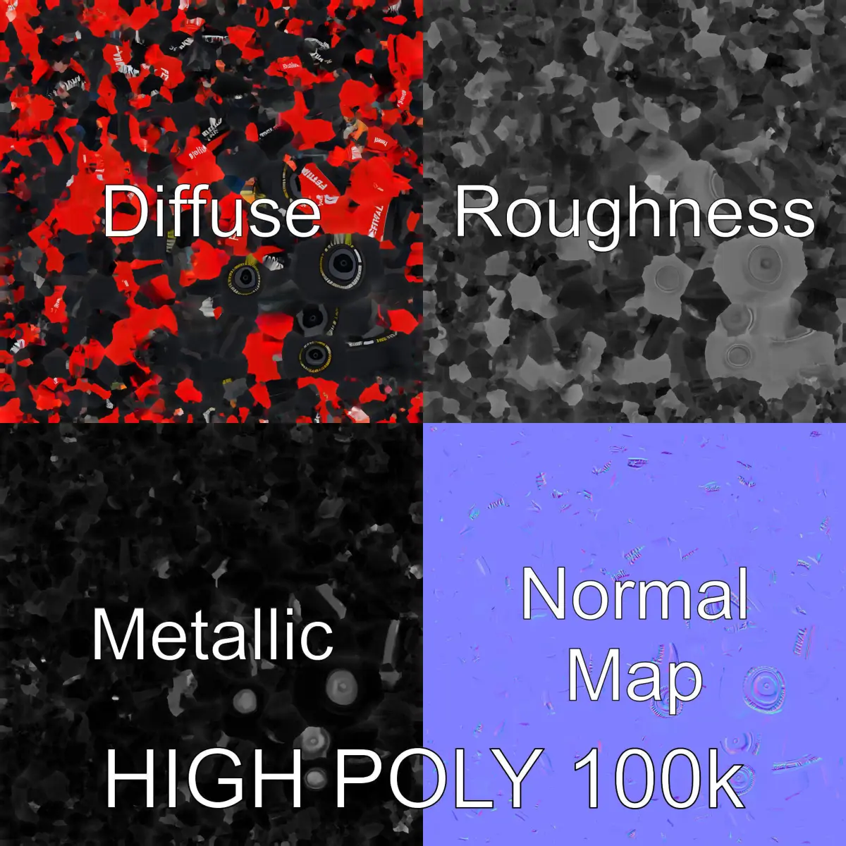 Each model has 3 levels of detail: low-poly, middle-poly, and high-poly, which allows for the use of this model in production rendering (such as 3ds max, Maya, Cinema4d, Blender, Vray/Corona/Cycles and all other), game engines (Unity and Unreal compatible), and interactive presentations, providing a choice of detail based on the LOD System principle. Ideal for simulations, racing games, and design visualization. The model features a sleek aerodynamic form, vibrant red and black color scheme, and detailed tire treads with sponsor logos. The complex spoiler structure adds realism, while textures are PBR, Diffuse, NormalMap, and reflection/roughness/metallic, suitable for any modern rendering engine. All models accurately unwrapped with no overlapping UVs. Textures are 4096*4096 in size. Remember to like and leave a comment for the model if you enjoyed it!