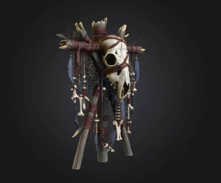 This totem is designed to serve as a powerful environmental storytelling asset for games and cinematic projects. Whether as a warning sign marking cursed territory, a shamanic altar deep within a forgotten jungle, or a sacred object within a tribal village, the effigy adds depth, mood, and authenticity to any world-building scenario. The hanging ornaments—bones, feathers, thread bundles, and ritual charms—move the viewer’s eye around the structure, hinting at a dark culture rooted in primal energy and spiritual significance.