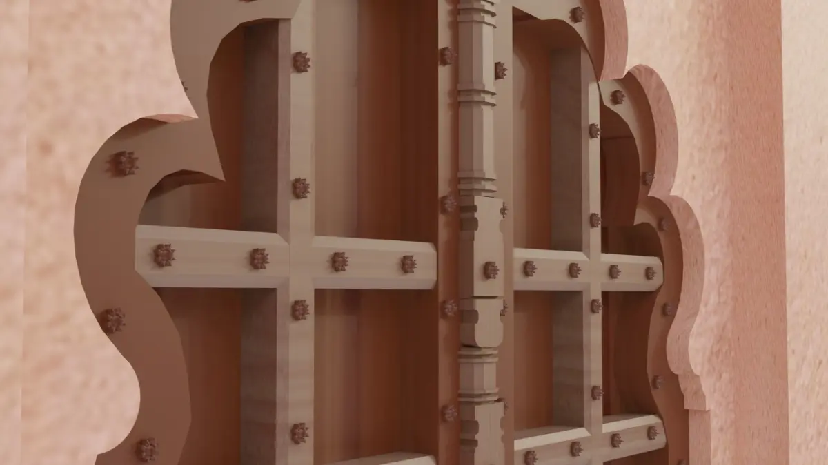 Agra fort entrance door design, with sand stone textured wall and wooden textured door.
