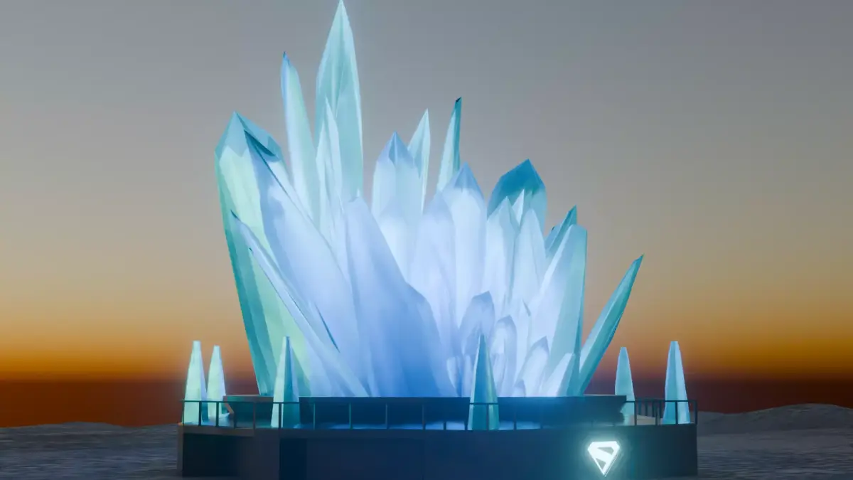 The Fortress of Solitude is a high-quality 3D model created in Blender, inspired by a futuristic crystal sanctuary rising from a frozen and desolate landscape. This striking structure features a circular base platform surrounded by protective railings, from which massive translucent crystal formations emerge dramatically toward the sky.