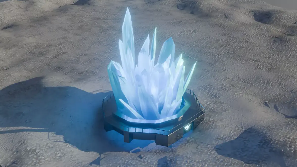 The crystalline centerpiece is designed with sharp, angular shapes and semi-transparent materials that simulate ice or alien crystal structures. The model includes detailed geometry and carefully crafted materials to achieve a cold, luminous aesthetic, enhanced by subtle glow effects and atmospheric fog for a cinematic appearance.