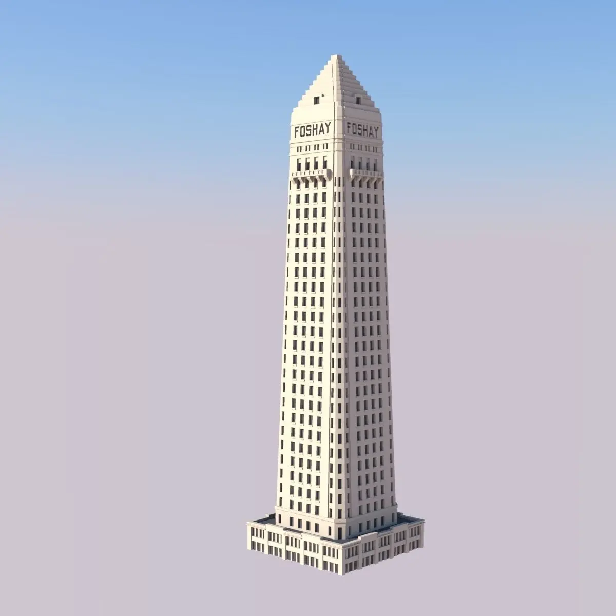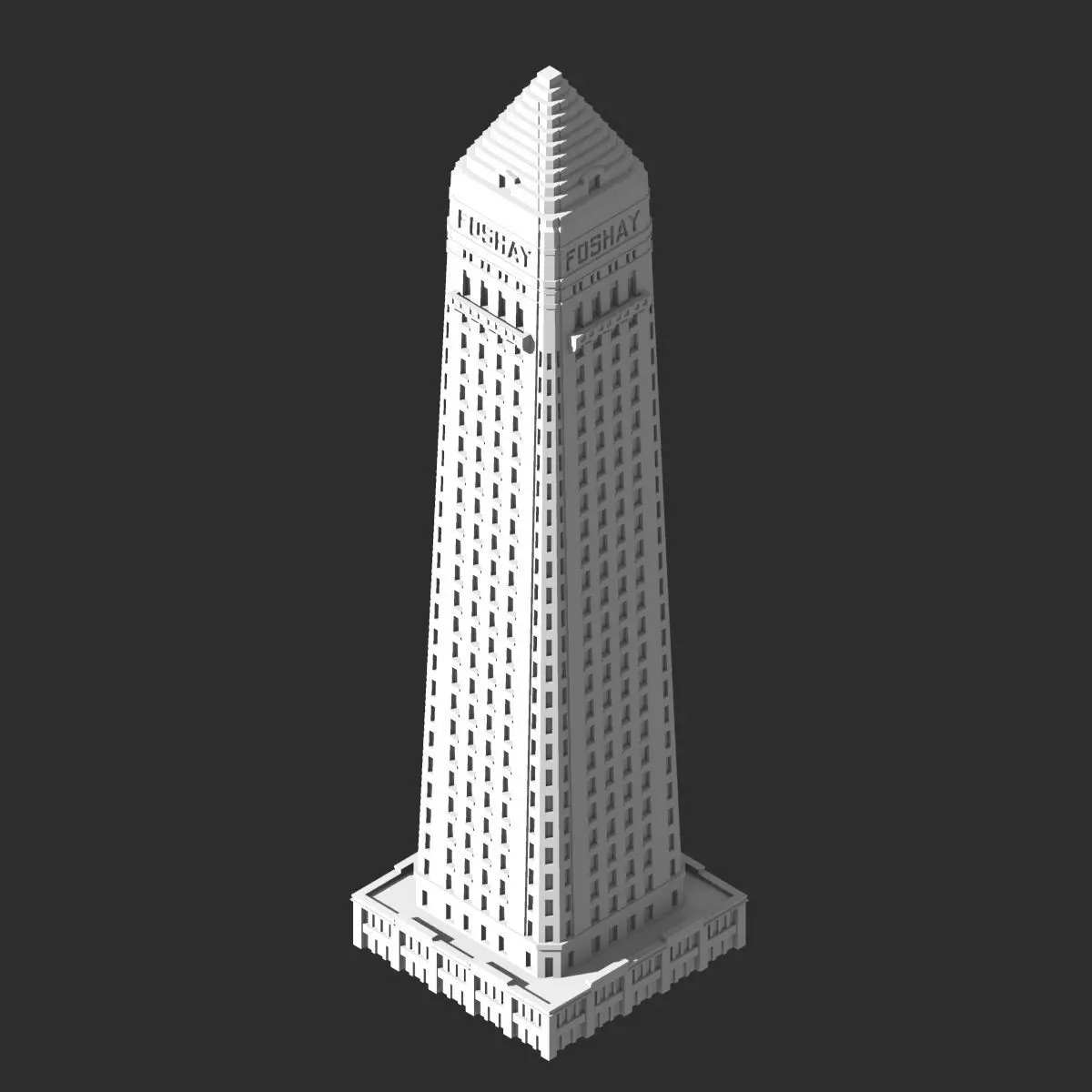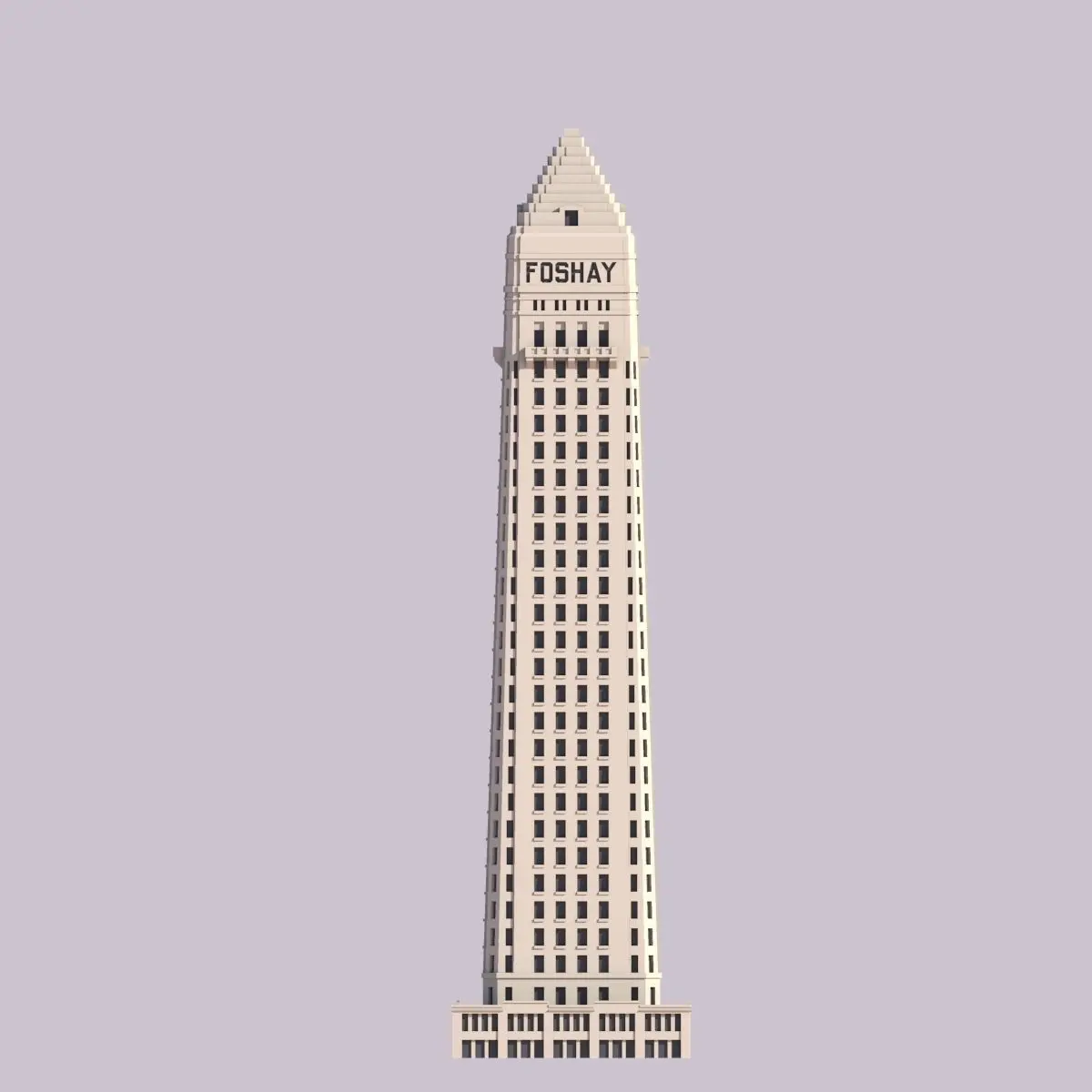 The Foshay Tower is a 607ft (185m) tall skyscraper in Minneapolis, Minnesota. The building was built in 1929 as the tallest building in Minneapolis. Wilbur Foshay, the tower's namesake, was an eccentric businessman and pyramid schemist who envisioned the building as an art deco skyscraper modeled after the Washington Monument. The building opened to an over-the-top three-day celebration accompanied by music by John Philip Sousa.