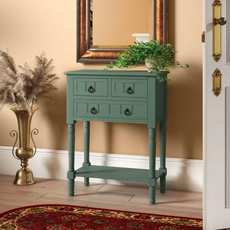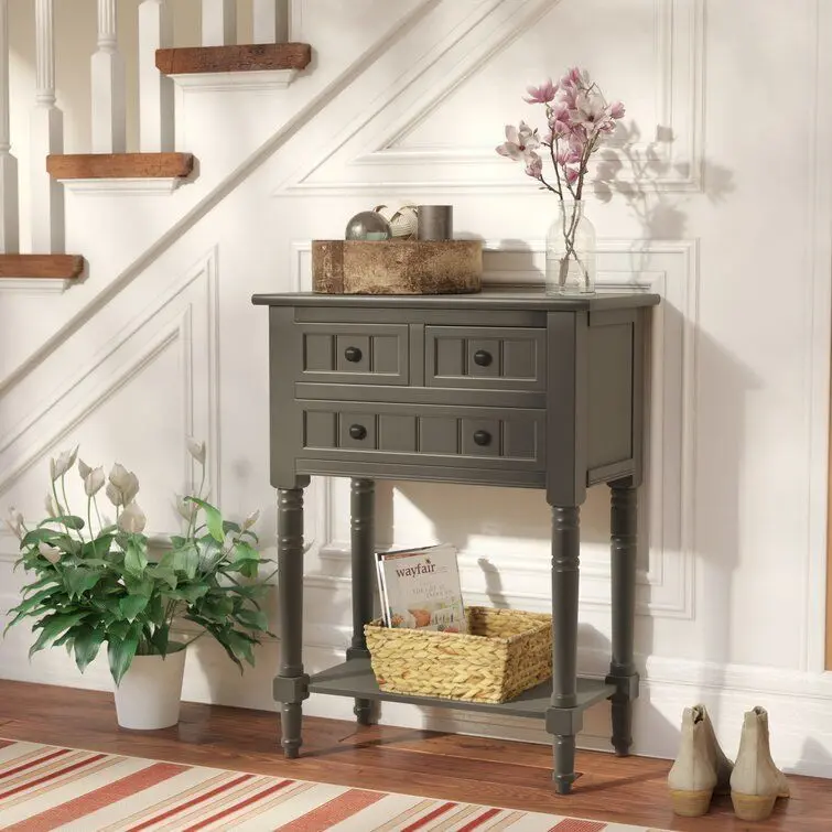 - Bring a cottage-chic style to your space with this small console table. Crafted of a solid and manufactured wood in a handsome finish, this console table features simple mouldings beadboard panel details, metal ring hardware, and turned post legs. Three drawers offer plenty of storage space for smaller accessories, while an open lower shelf is great for stacking books or clustering collected curios.