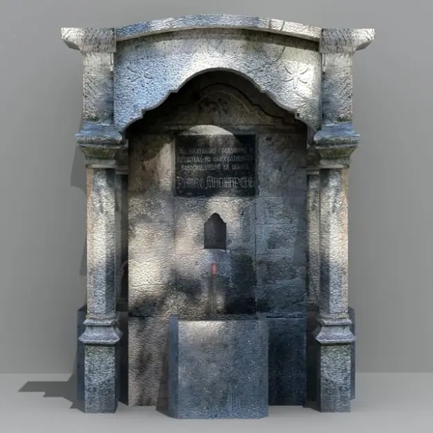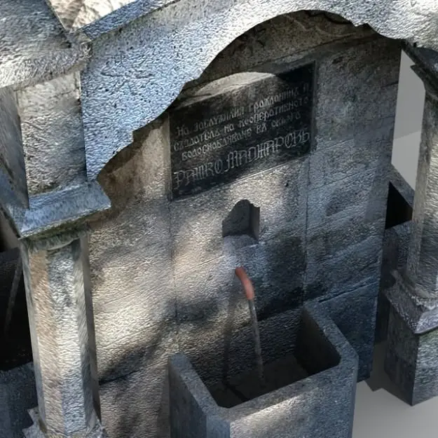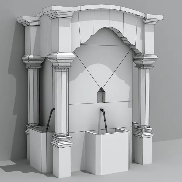 Stone fountain spilling water 3D model. Vray materials and 2600x2000 textures included (diffuse, bump) Unwrapped UVs Available in Vray and standard materials max 9 format, C4d 12, 3ds and obj.