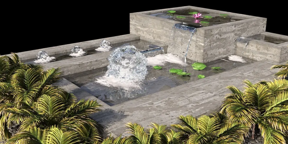 PONDS AND WATERFALLSthe model includes ponds ,waterfall, fountains palm and lotus and lily on water plants