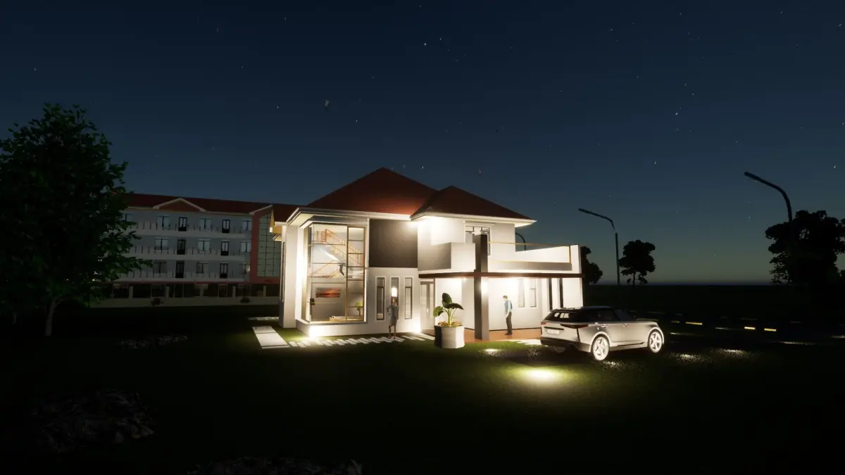 This is a composition of a four bedroom house in a composition with an apartment in the background. The apartment is also detailed. Its done in archicad and rendered in twin motion.
