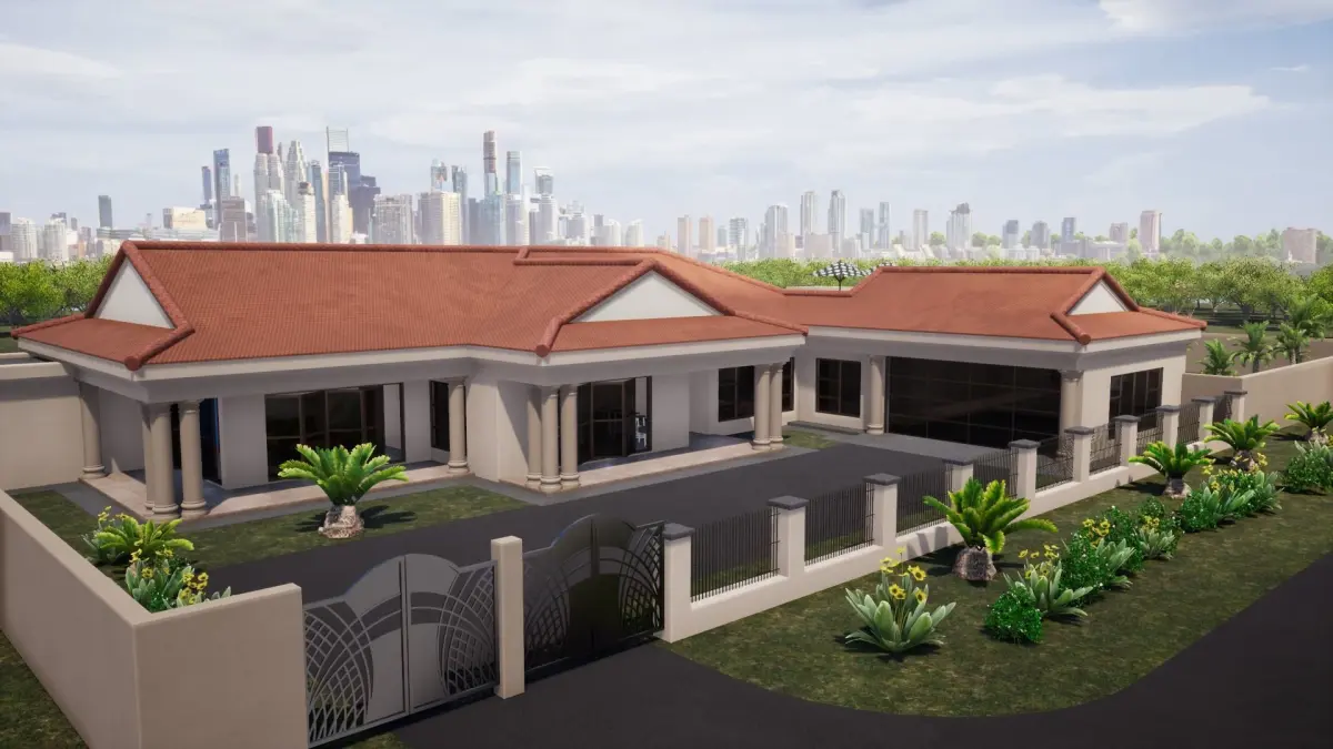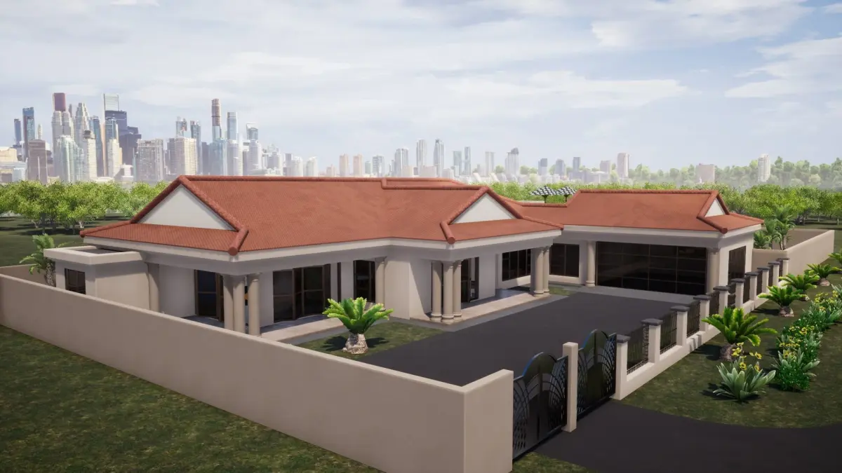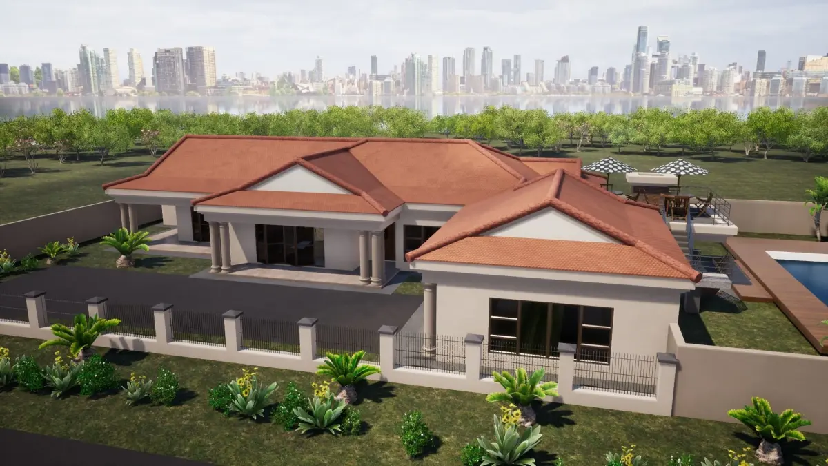 Single story building with concrete deck and four bedrooms. Designed and modelled in revit 2020and rendered in twinmotion 2018.