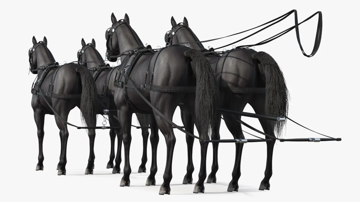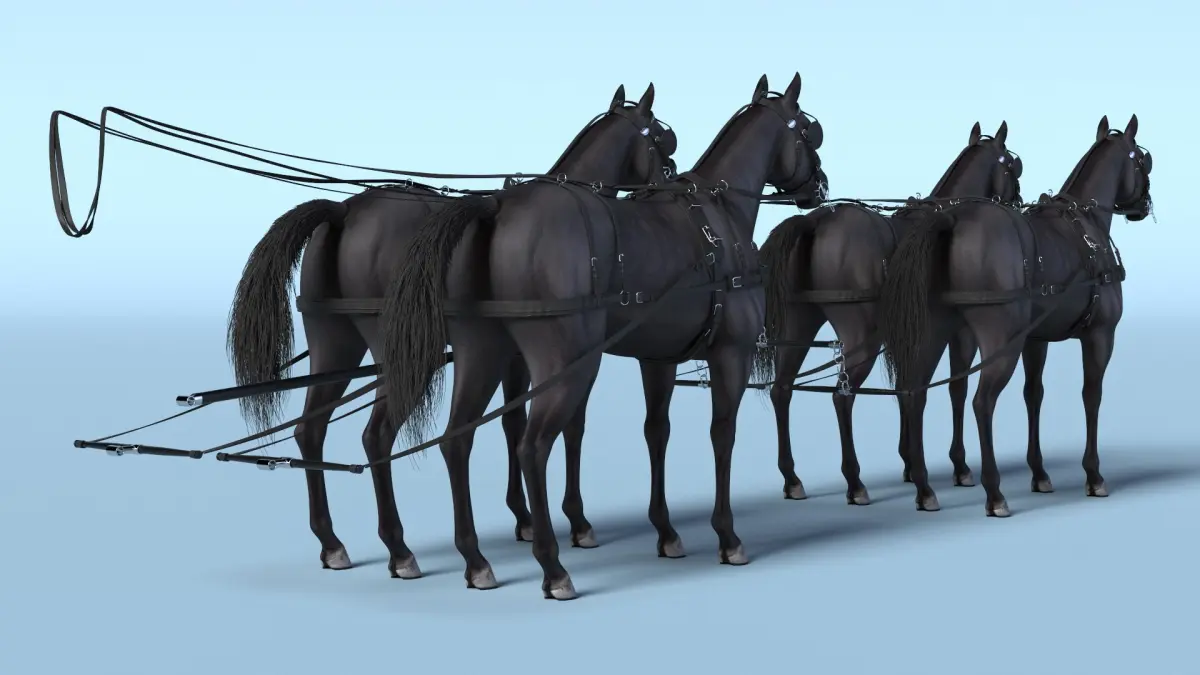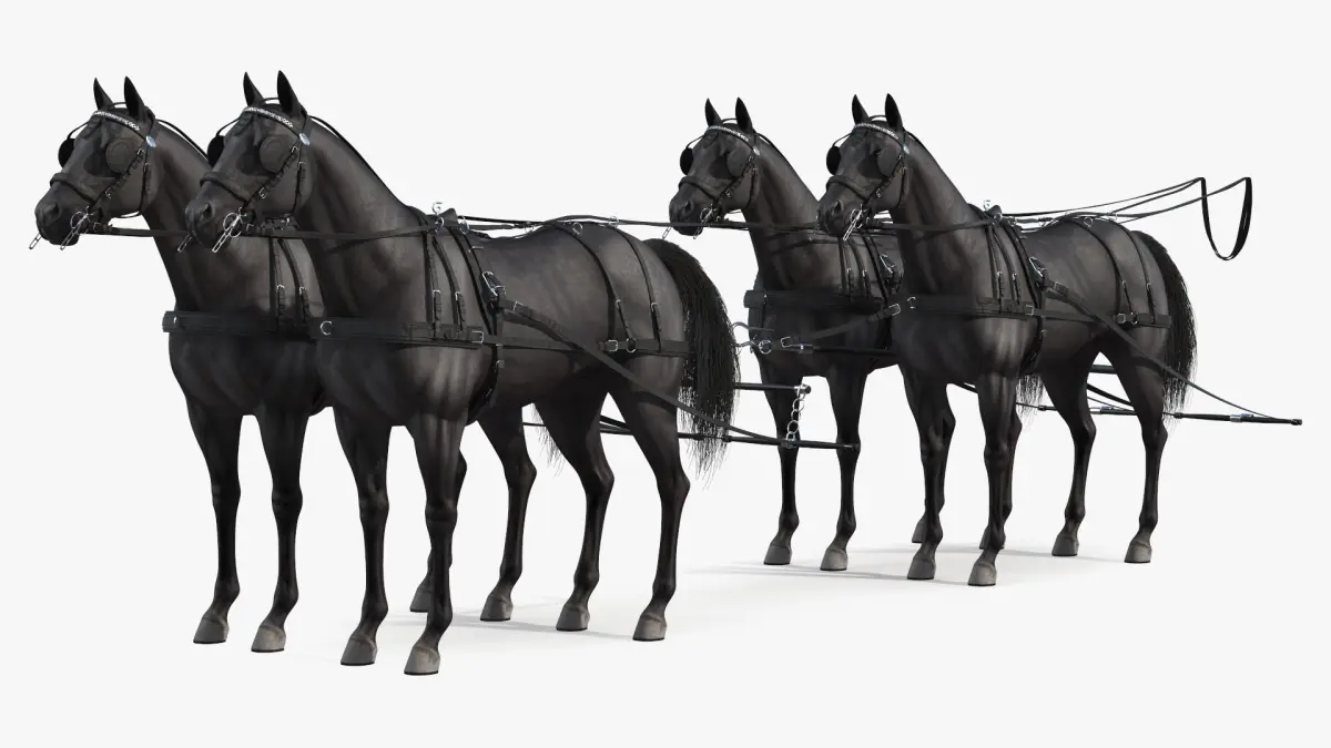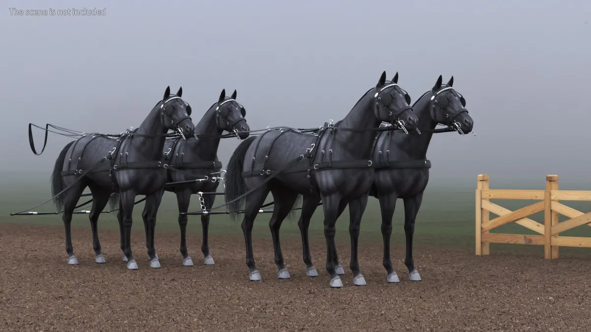 Four Black Horses in Breast Collar Harness is a three-dimensional model of four-horse team equipped with a breast collar driving harness, which designed for high-performance racing.