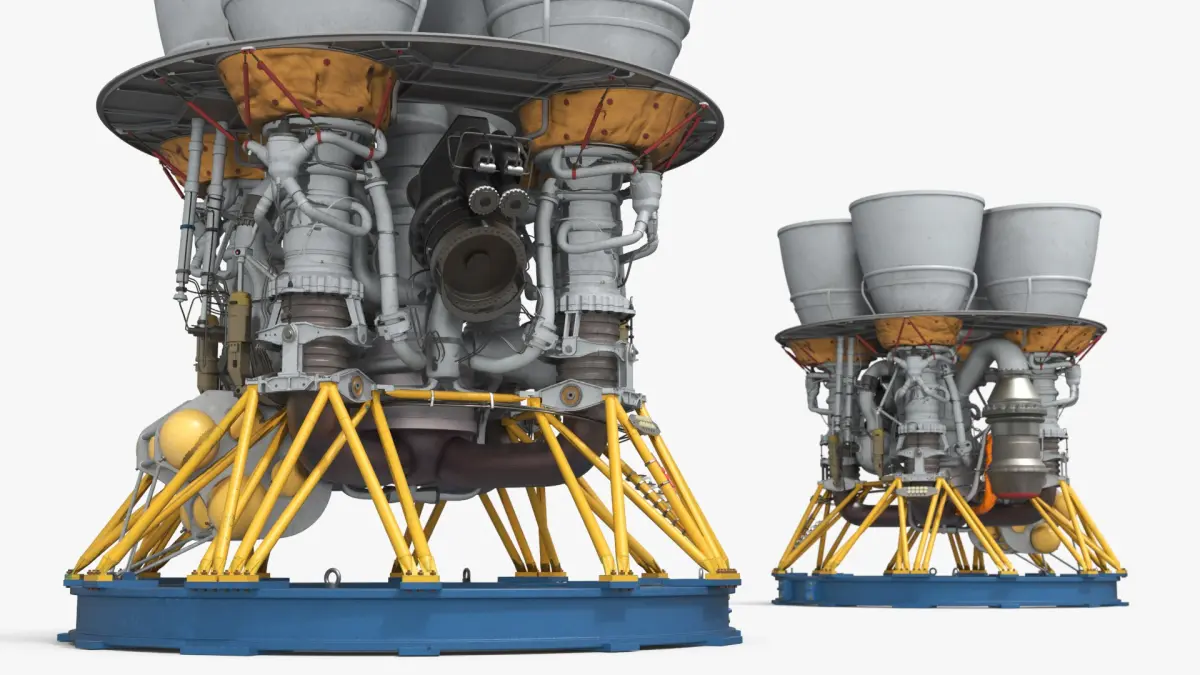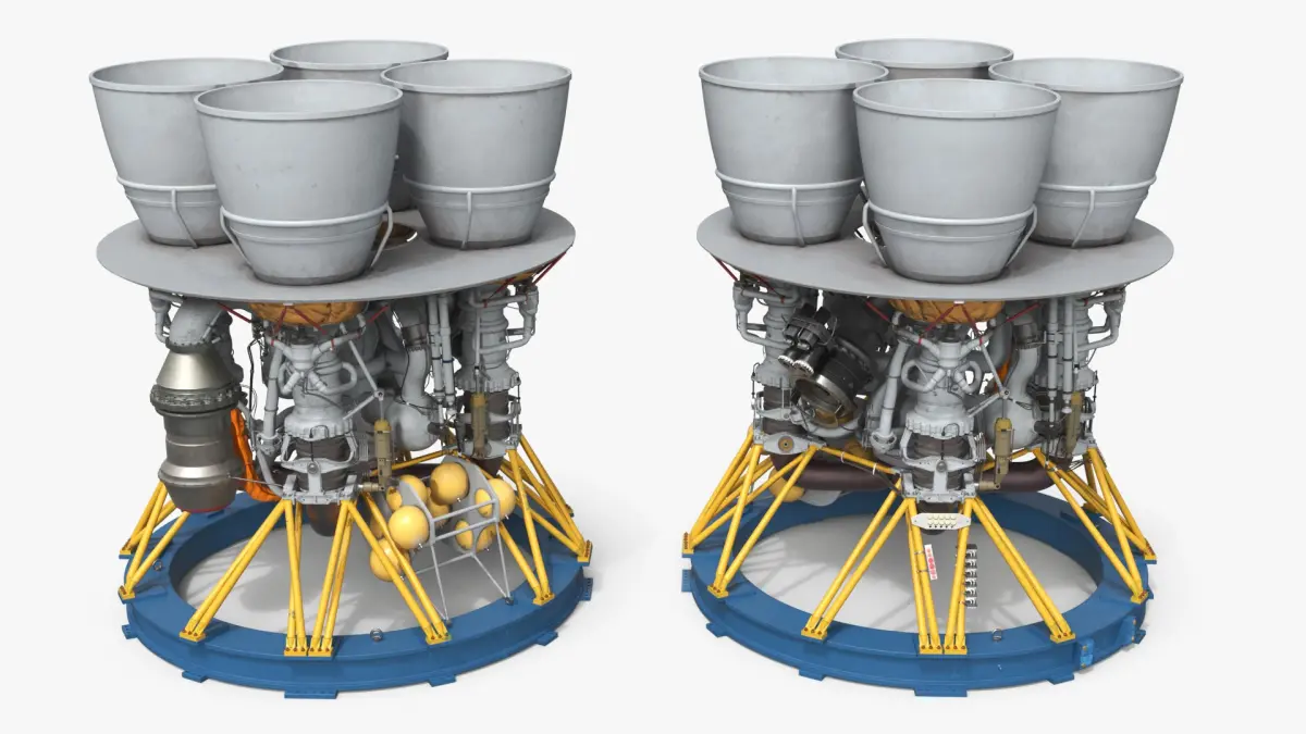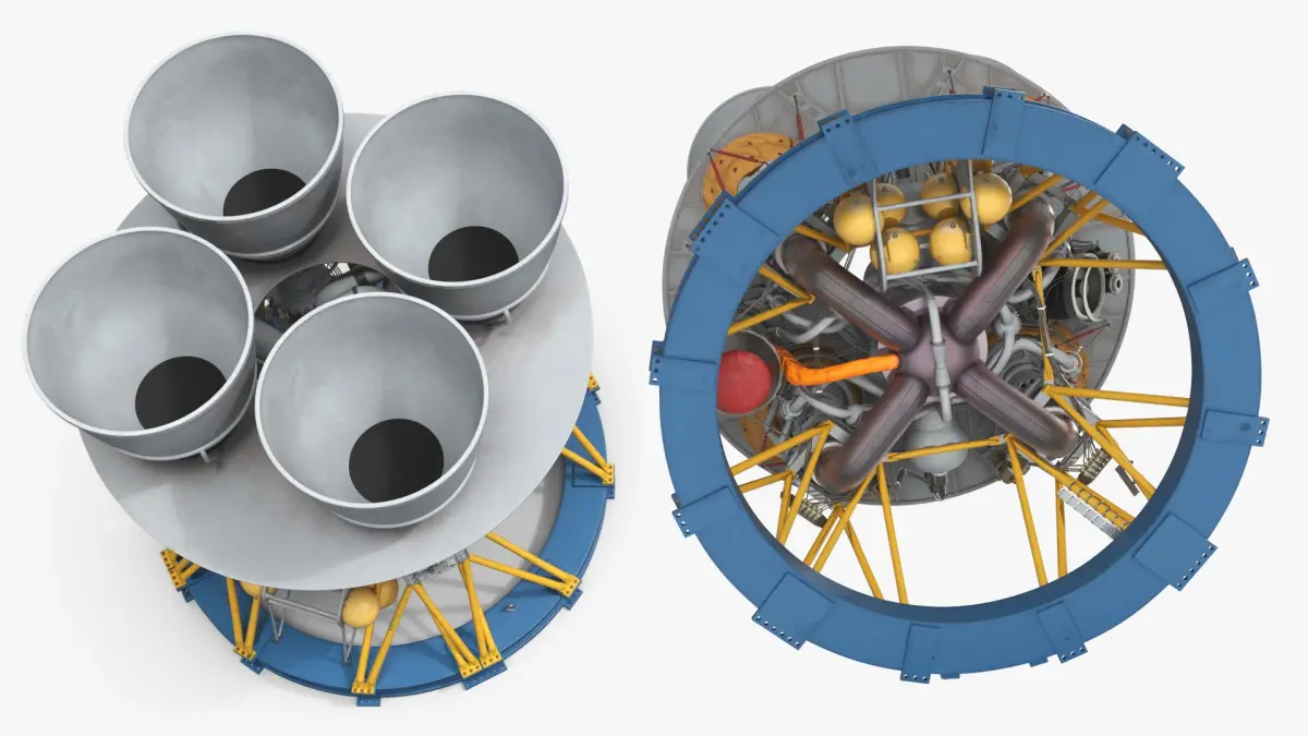 Four-Chamber Liquid Rocket Engine with Yellow Struts Grey is a high quality, photo real 3d model that will enhance detail and realism to any of your rendering projects. The model has a fully textured, detailed design that allows for close-up renders, and was originally modeled in 3ds Max 2020 and rendered with V-Ray. Renders have no postprocessing!