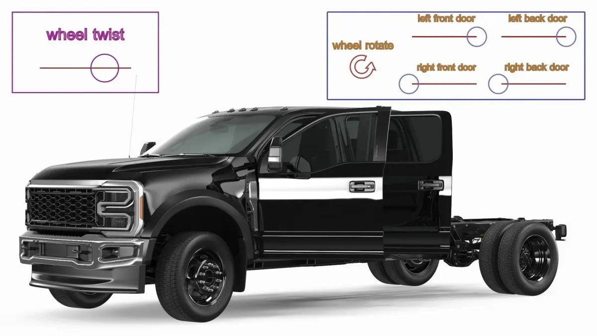 Four Doors Black Chassis Cab Rigged for Cinema 4D3d model is ready to be animated. You can easily position it the way you need or animate it the way your project requires in Cinema 4D R17.Check the renders to get an idea of how animation works.