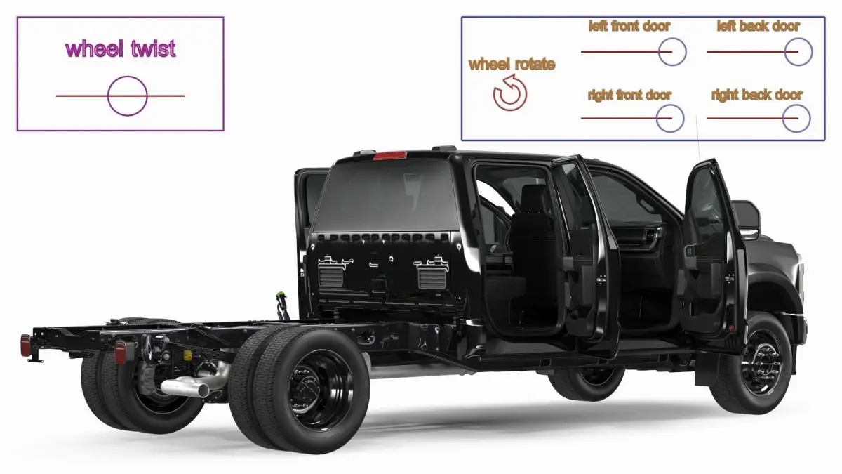Four Doors Black Chassis Cab Rigged for Maya 3d model is ready to be animated. You can easily position it the way you need or animate it the way your project requires in Maya 2016.Check the renders to get an idea of how animation works.