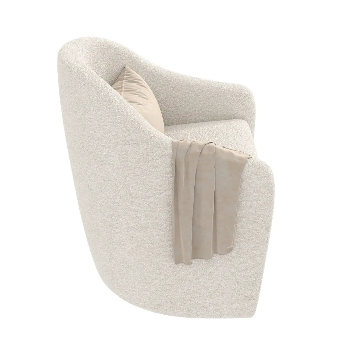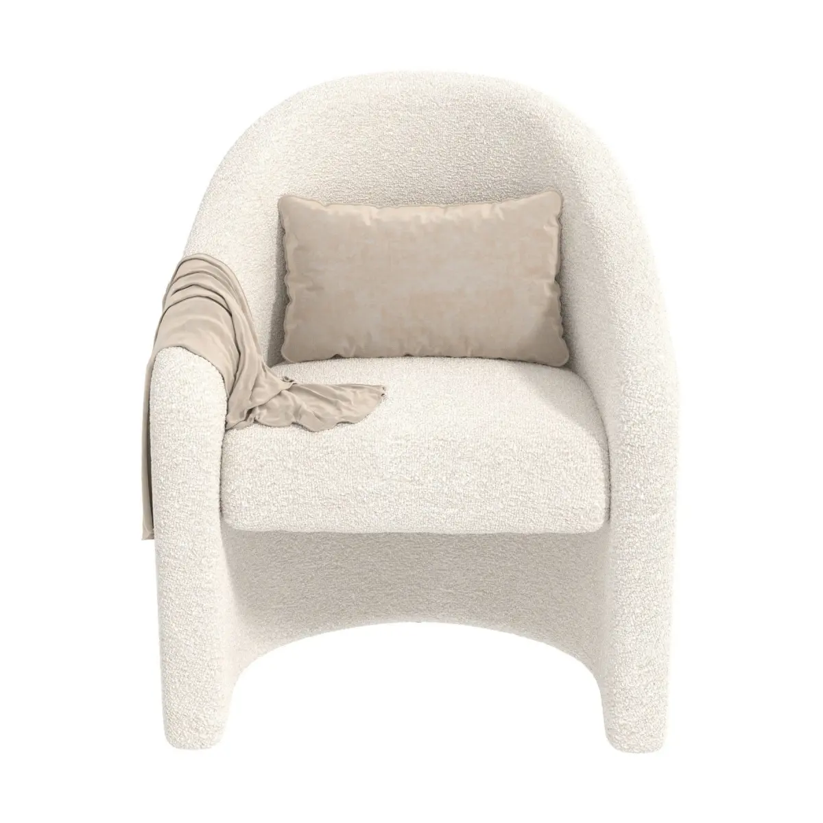 A soft, modern dining chair featuring sculpted curves and tight, tailored upholstery for a luxe look. Textural bouclé performance fabric is specially created to withstand spills, stains, high traffic and wear, ensuring long-term comfort and unmatched durability.26W x 25.75D x 32HColor: Knoll SandMaterial: 95% Pl, 5% PcSeat: 19D x 19H, Arm: 22.25H from floor, 3.25" from seatSeat Construction: WebbingPlease allow 2-4 weeks to ship