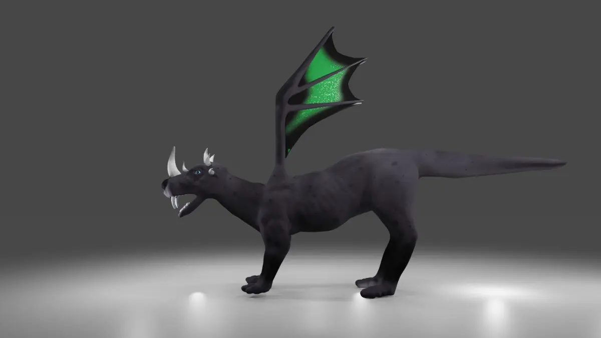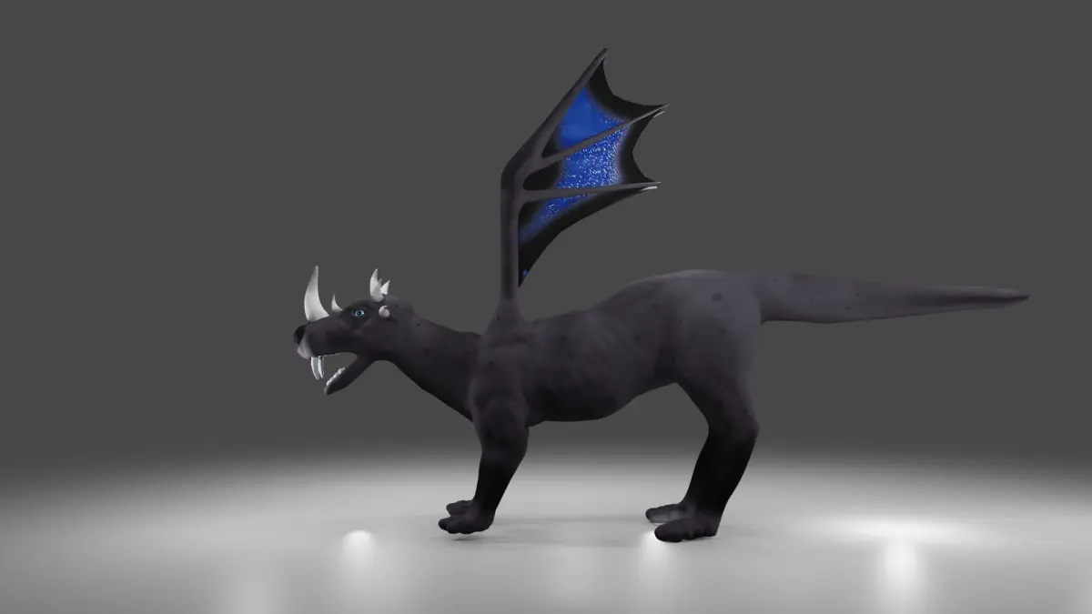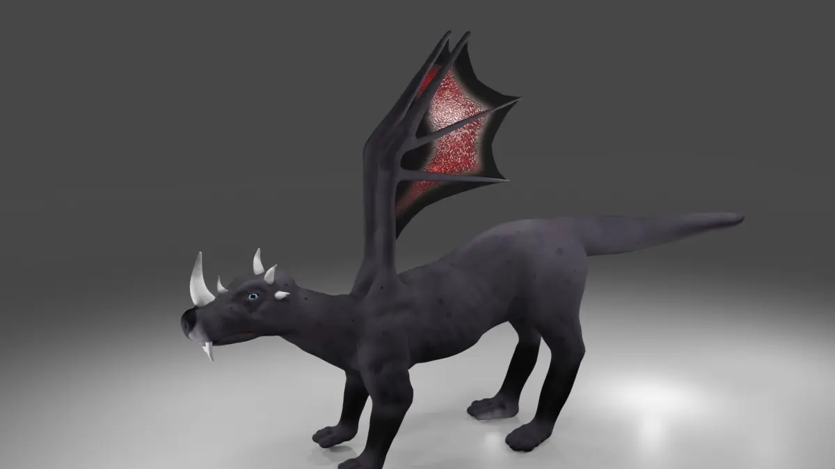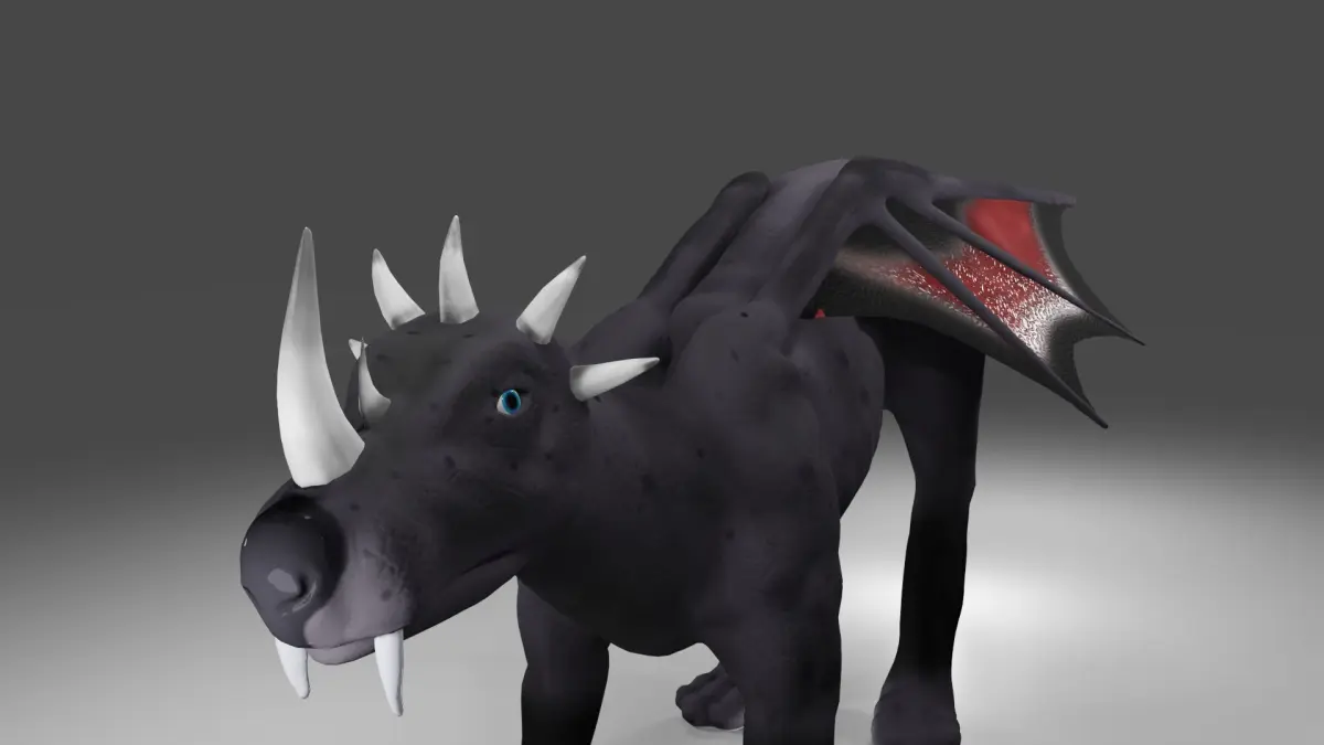 Textures are in 4096x4096. The body has diffuse, metallic, rough and normal. The eye has diffuse map that requires alpha clipping or alpha blending. The horns contain a diffuse, normal map. Metallic and rough for the horns was defined using a texture. The teeth contain diffuse and normal map, metallic and rough was define dusing a texture. The wing skin texture contains a diffuse, normal map, metallic and rough texture map. Emmision is zero for all parts.