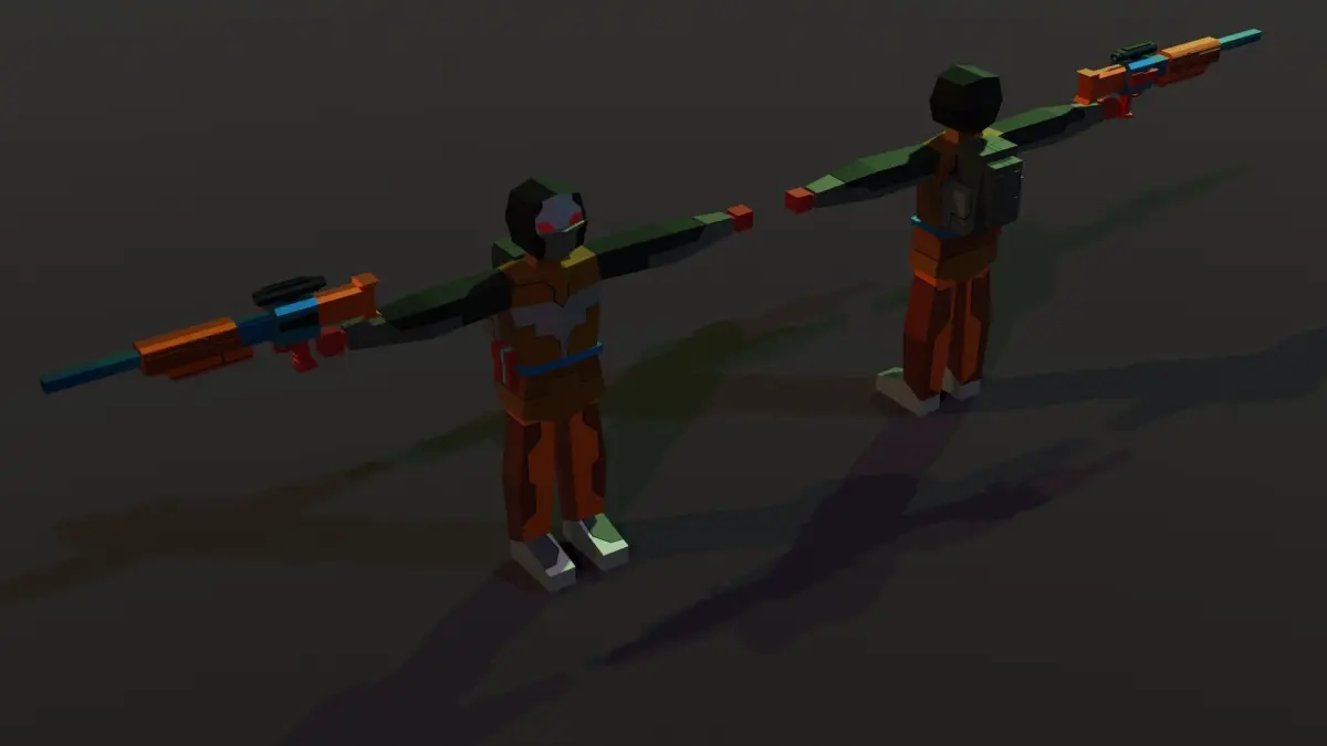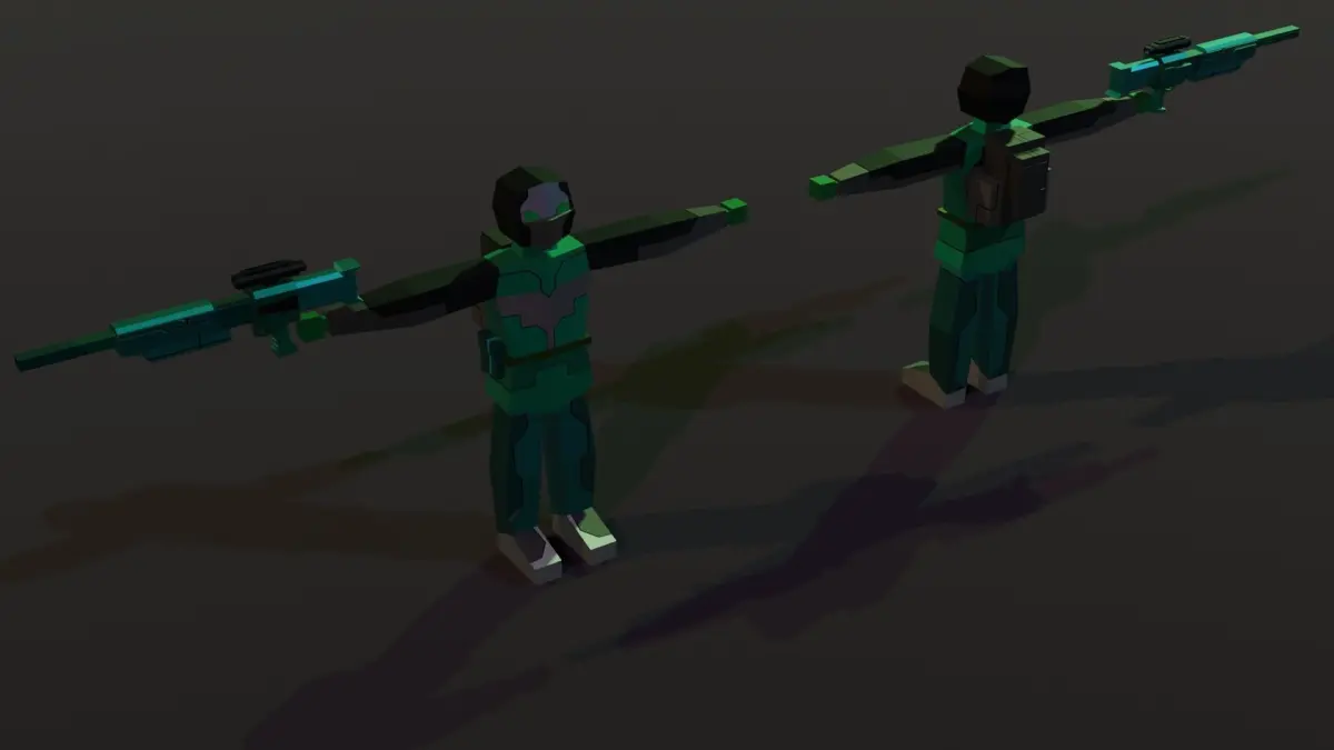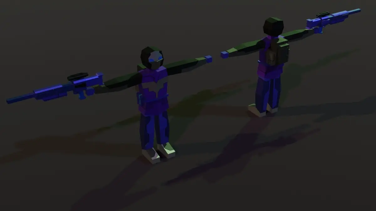 Four Low Poly Models of Sci-Fi SoldiersAnimated, RiggedAnimations - SoldierIdle, SoldeirRun, SoldierRunFire, SoldierFire, SoldierReload, SoldierStay(Tpose)Vertics - 2572 On One ModelPoligons - 2221 On One Model