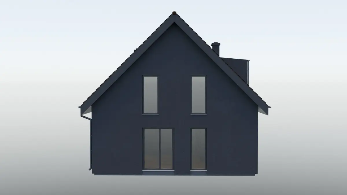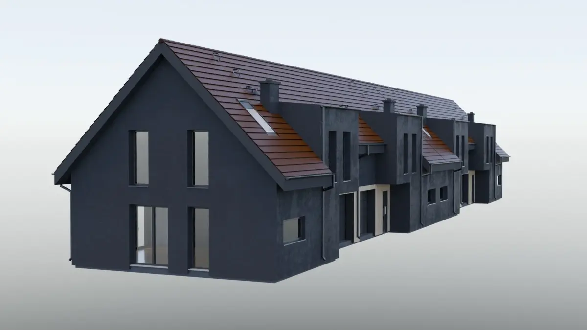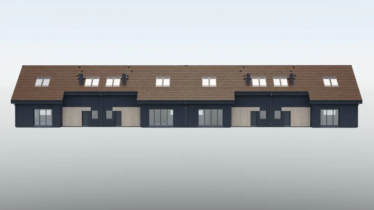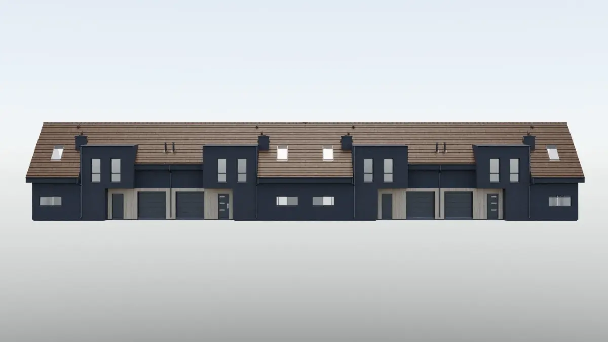 four private houses are connected into one long house. all four houses are identical, two floors, garage, front and rear doors