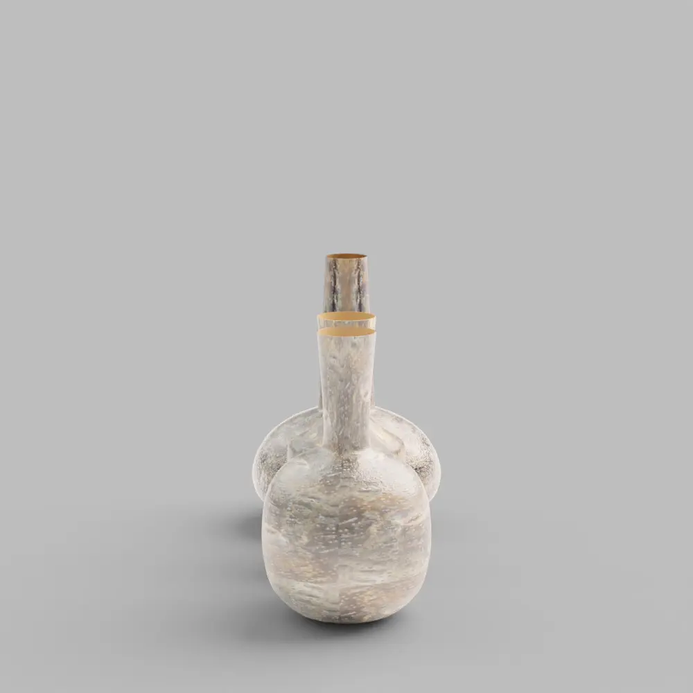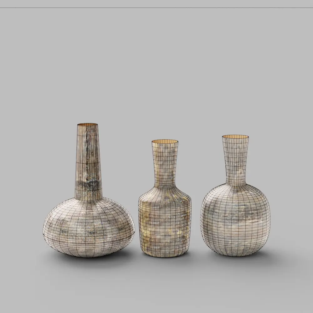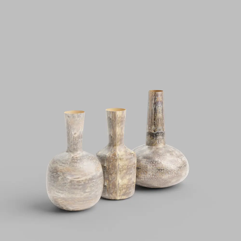 The Fowler Vases, sold as a set of three, include three uniquely shaped and textured patinated metal vases. Each vase features a rounded body, elongated neck and narrow mouth opening, though each shape varies slightly.